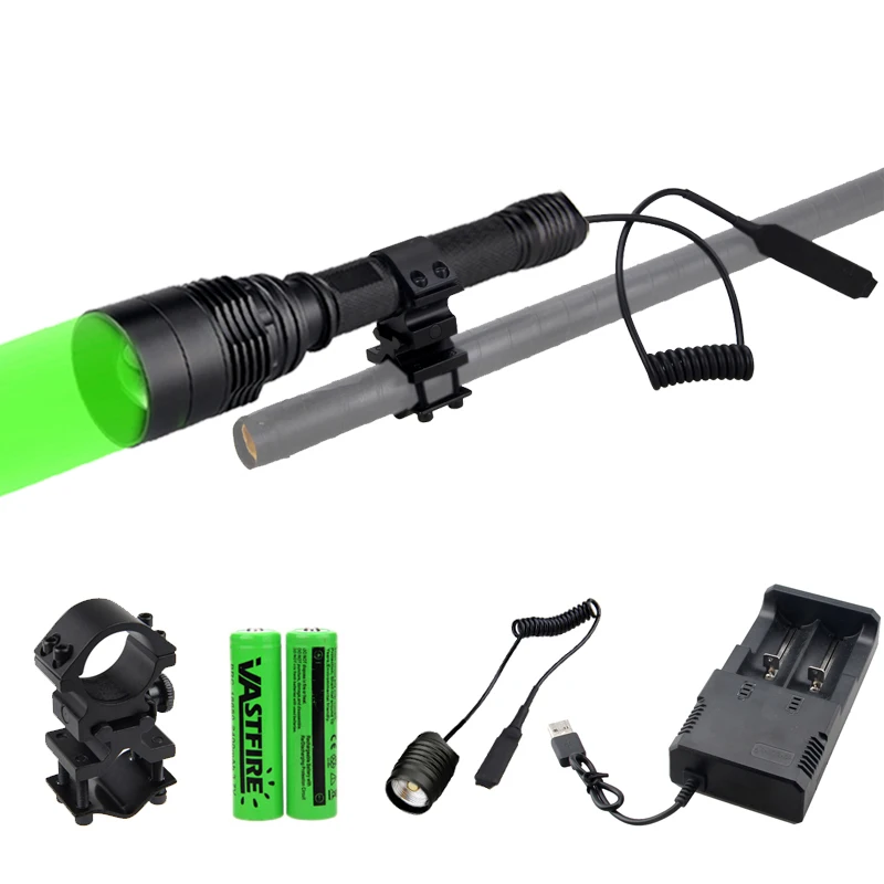 Характеристики фонарика:** Масштабируемая вссветильник шка для охоты** В этом фонаре используется светодиод T6, который дает очень яркий луч светильник** Яркость на выходе может достигать более 10000 люмен** Внутренняя проводка применяет высокоэффективную схему бустера и может максимально использовать батареи** Корпус этого фонаря изготовлен из авиационного алюминиевого сплава, и он имеет очень прочную конструкцию** Твердоанодированная отделка; Антиабразивный, устойчивый к царапинам, ударамТип Излучателя: светодисветодиодный Т6Цвет светильник: зеленый светильникКонфигурации аккумулятора: 2 батареи 18650 3,7 в (Optioanl)Расположение переключателя: ХвостСрок службы светодиодный: 100000 часовМатериал: алюминийЛинза: линза из стекла с покрытиемОтражатель: Алюминиевый гладкий отражательЦвет корпуса: черный