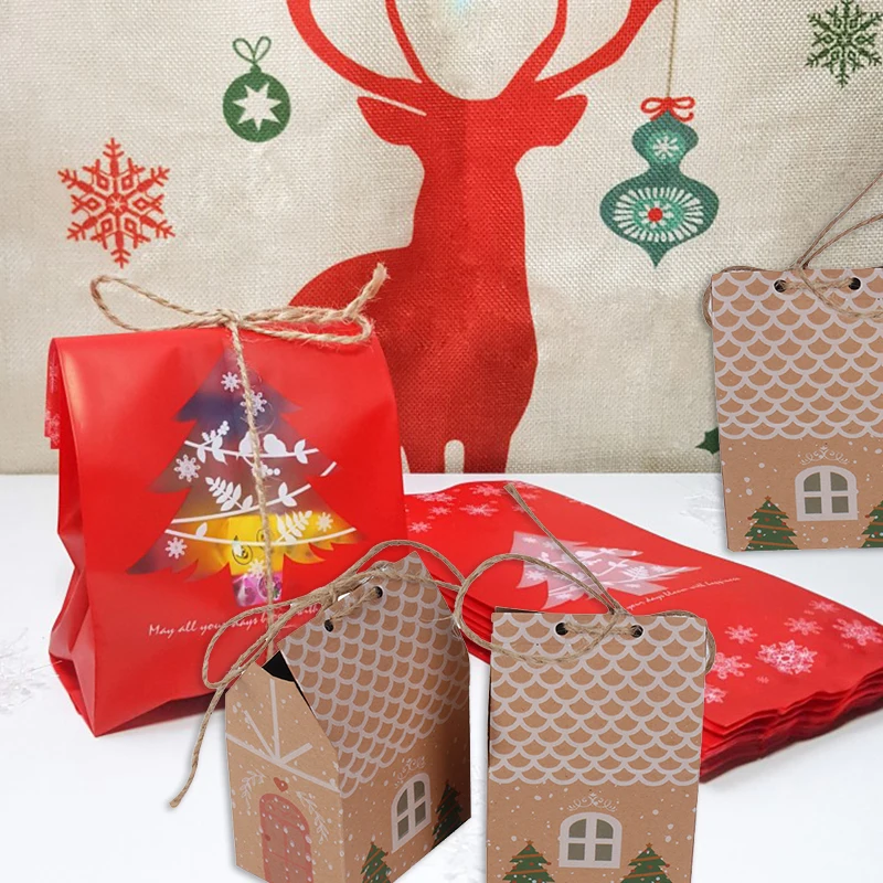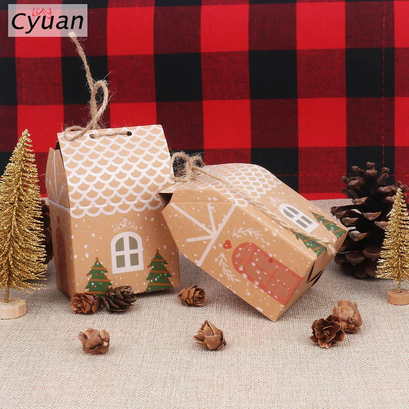 Cyuan, 5 шт., миниатюрная Подарочная коробка для рождественских конфет в форме домика с веревками, сумки для печенья в виде рождественской елки, яркая Рождественская сумка