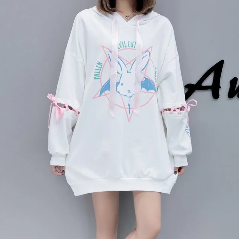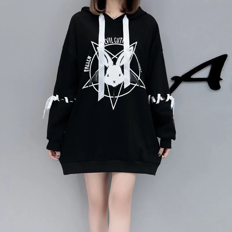 Женские толстовки с капюшоном, спортивные костюмы в готическом стиле, толстые, свободные, с изображением кролика, размера плюс, зима, японское ретро