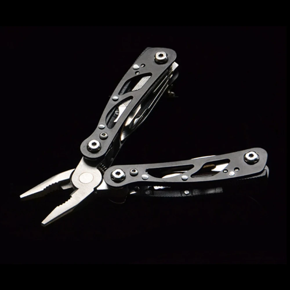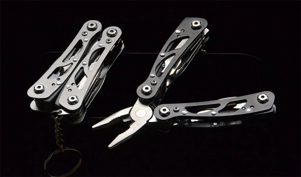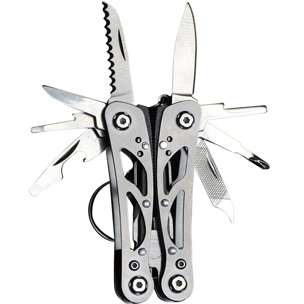 Особенность: -Многофункциональные инструменты-плоскогубцы, резак, полупила, острый скребок, маленькая Однослойная отвертка, открывалка для бутылок, большая отвертка, нож,Шлицевая отвертка, серп, удаление накипи, кольцо для ключей. -Эргономичная ручка, легкая и прочная, удобная для захвата, портативная, удобная в использовании. -Используется для активного отдыха, кемпинга, пеших прогулок, рыбалки, пикника и так далее.