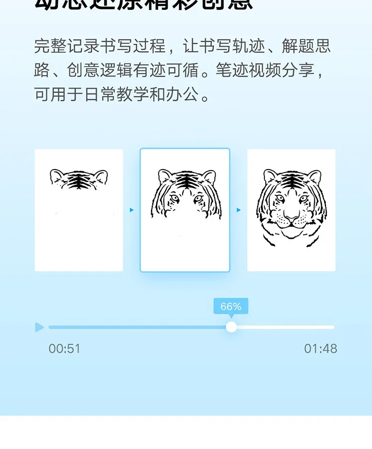 Полностью записывает процесс письма, чтобы проследить траекторию письма, идеи решения проблем и творческую логику. Обмен почерком видео используется для ежедневного обучения и работы в офисе.