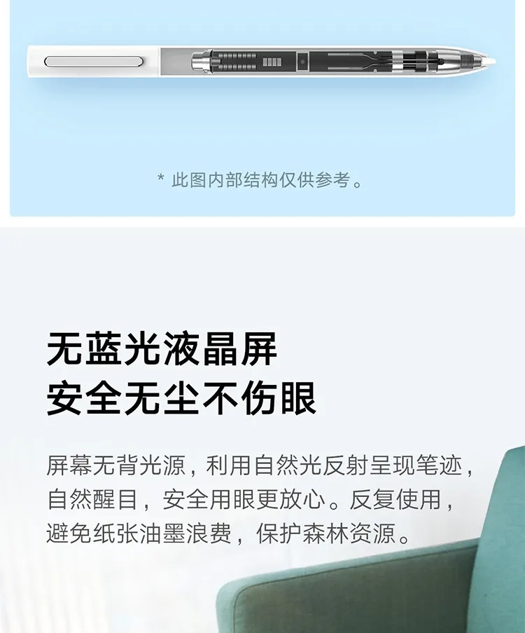 Экран не имеет задний светильник и использует естественный отражающий светильник, чтобы представить естественный и привлекательный почерк, что облегчает безопасное использование глаз. Повторное использование, чтобы избежать отходов бумажных чернил и защитить лесные ресурсы.