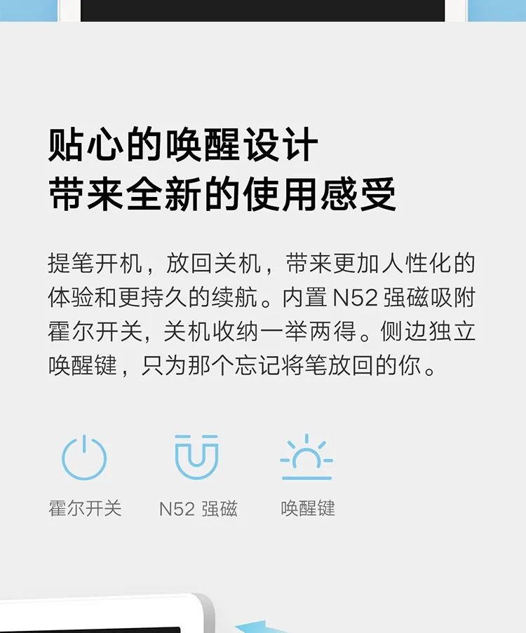 Приподнимите ручку для включения и положите ее обратно, чтобы выключить, обеспечивая более удобный для пользователя опыт и более длительный срок службы батареи. Встроенный N52 Сильный магнитный переключатель для адсорбции холла, выключение и хранение убивает двух птиц одним камнем. Независимая кнопка пробуждения сбоку, только для тех, кто забыл вернуть ручку.