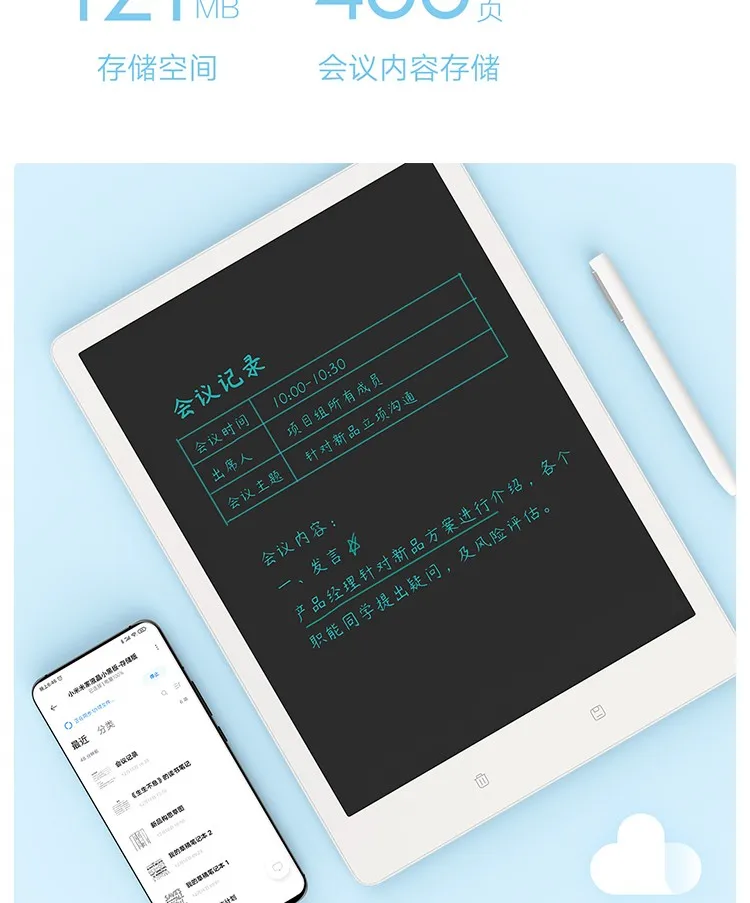 Встроенный 121 МБ объем памяти, поддержка 400 страниц хранения содержимого собрания *. Вы также можете сохранить написанное содержимое локально с помощью одной кнопки без мобильный телефон, что удобно и быстро. После подключения мобильный телефон, он поддерживает резервное копирование на облачном диске Xiaomi, и важное содержание безопасно.