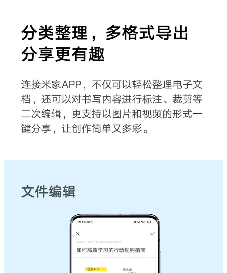 Подключение к приложению Mijia может не только легко организовывать электронные документы, но и выполнять вторичное изменение, например маркировку и обрезание написанного содержимого. Он также поддерживает обмен одним нажатием в виде изображений и видео, что делает создание простым и красочным.