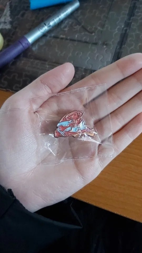Отличный значок. Практически сказать не чего - Металл хороший, Краска выглядит хорошо, не слезает. Детали четкие и выглядят в целом - очень "аппетитно". Немного непривычно от резиновой защелки, вместо железкой с фиксаторами, выглядит менее надежно и удобно, а в остальном - Просто чудо и прелесть