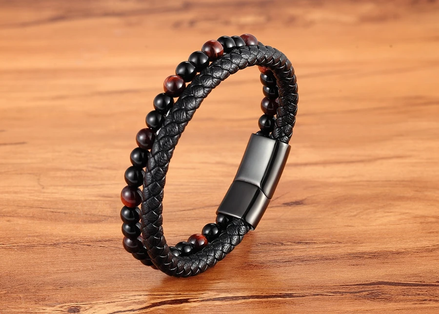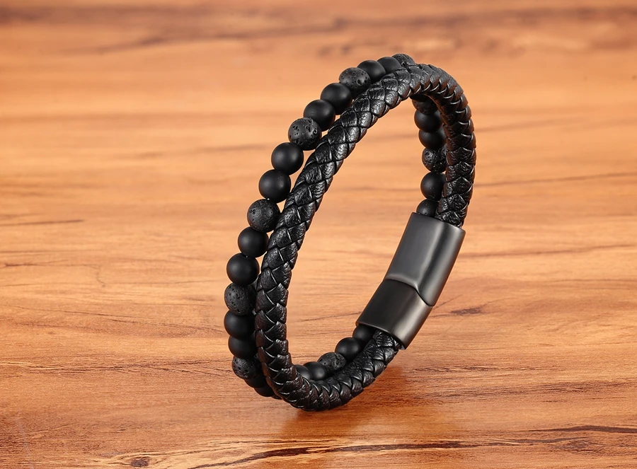 Браслет мужской из кожи и бусин, Классический Комбинированный Кожаный браслет с черными пуговицами из нержавеющей стали сделай сам, для мальчиков