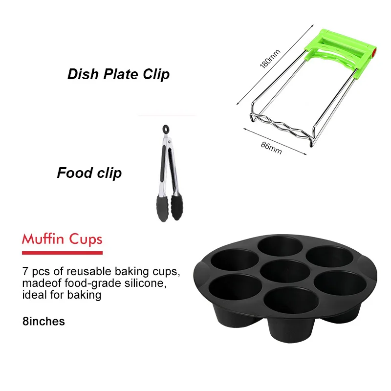 Высокое качество воздуха фритюрница Аксессуары 8 дюймов для Gowise Phillips Cozyna и Secura, набор из 10, подходит для всех Airfryer 3.7QT - 4.2QT - 5.3QT - 5.8QTПредотвращение ожогов-предоставление зажима для чаши и кухонного Тонга для безопасного подъема горячих тарелок и стеллажей из воздушной фритюрницыВысокое качество-сделано из пищевых материалов безопасности, покрытие для здоровья тефлоновое антипригарное покрытие, которое легко чистить и долговечно.Простота в использовании и безопасность/высокое качество и долговечность/Приготовление пищи стало более удобным и эффективным! Сделайте здесь вкусный торт, удобство и легкость в маневрении.Сделайте пиццу, яйца, блинчики и печенье, которое вам нравится. Предоставьте вам термостойкую поверхность, чтобы разместить горячие аксессуары.Позвольте второй слой пищи, максимизируя поверхность для приготовления пищи. Pefect для овощей и мяса shish kabobs.Хлеб, который нужно запечать, нарезанный на полке, и запеченный в фритюрнице с циркуляцией горячего воздуха. Вы можете испечь 7 мини-пирожных одновременно с воздушной фритюрницей. Отлично подходит для жаркой тарелки или миски из воздушной фритюрницы.Цвет: серебристый + черныйМатериал: силикон + нержавеющая стальПосылка:1 xCake баррель1 x сковорода для пиццы1 х силиконовый коврик1 х металлический держатель1 x шашлык (с 4 шашлыками)1 х раковина для хлеба1 x чашка для торта1 x зажим для тарелки1 x зажим для едыТолько вышеуказанная посылка, другие товары не включены.Примечание: светильник и различные дисплеи могут привести к тому, что цвет товара на картинке немного отличается от реального. Допускается погрешность в измерениях +/- 1-3 см. Не упустите свой шанс.