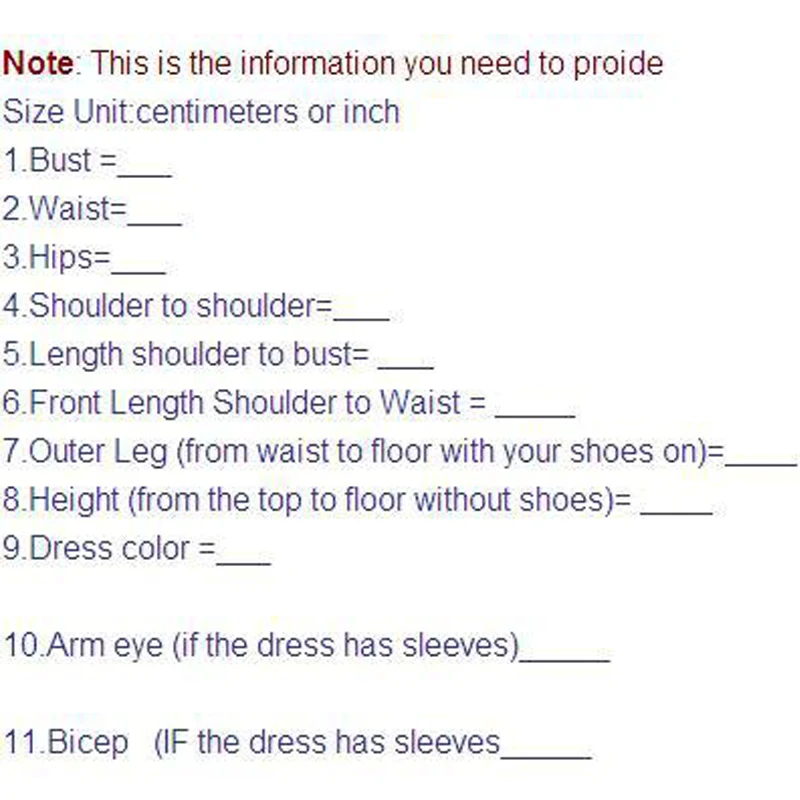 При размещении заказа, если у вас нет стандартного размера, пожалуйста, напишите свой подробный размер. Если вы стандартный размер, проверьте нашу таблицу размеров, мы делаем размер платья в соответствии с нашей таблицей размеров.