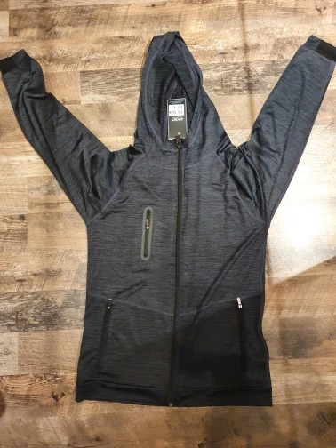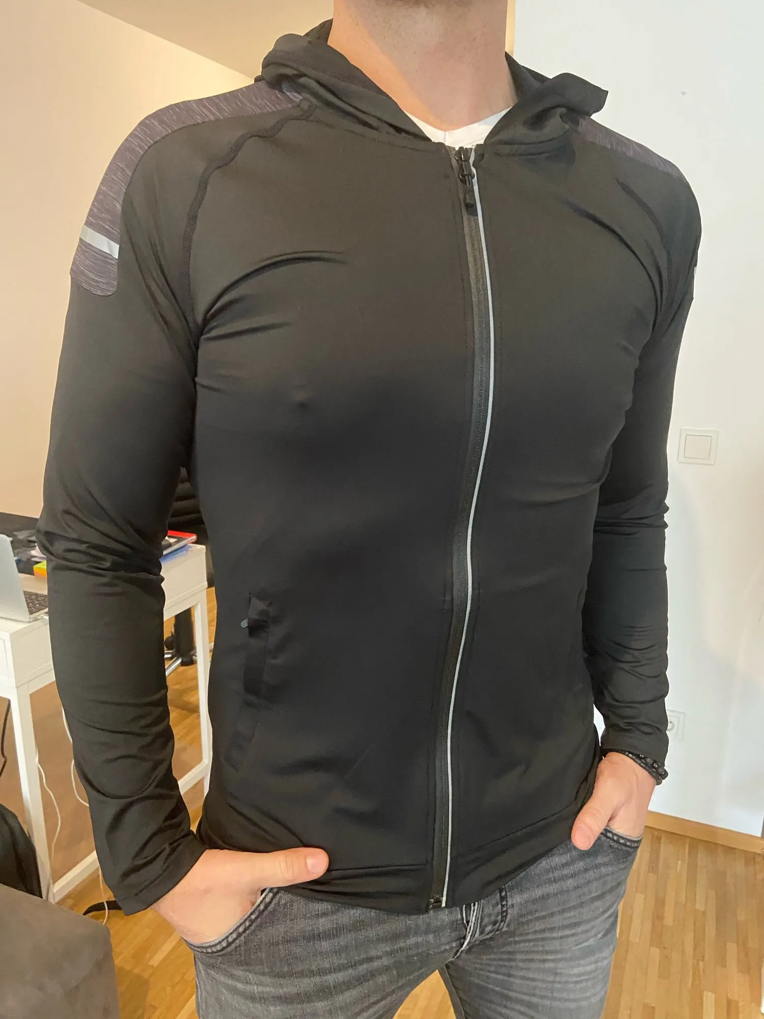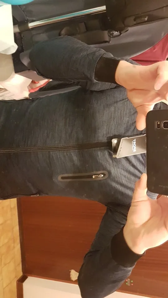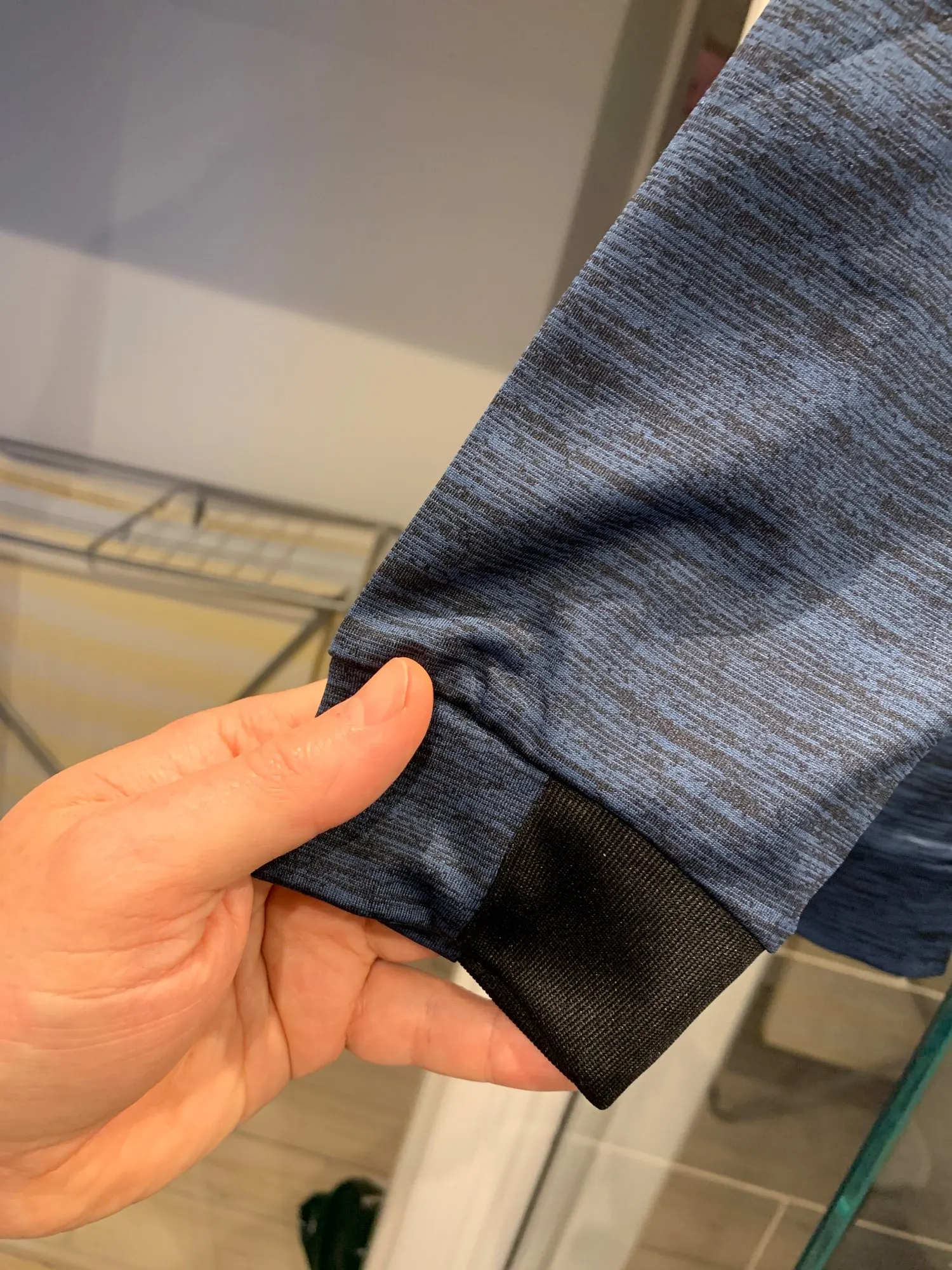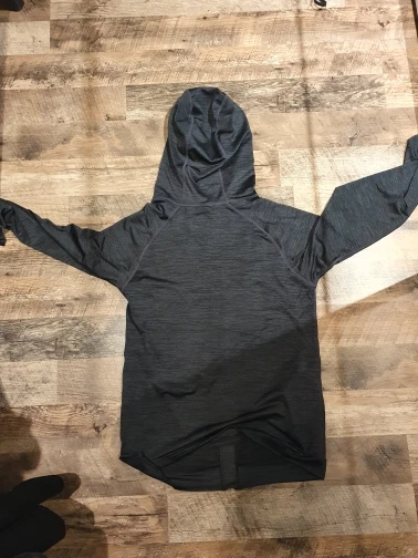 Плюсы: размер соответвует описанию. На свой 48 Ru купил М, все подошло. Еще красивая этикета ) Минусы: На ощупь футболка как будто из старого синтетического материала типа нейлона, а не полистера. Пошита небрежно. Прилагаю одно фото с нижней частью молнии, где вино, как криво пришита ткань под молнией. В других местах тоже торчат нитки. Фасон неудобный: воротник не прилегает достаточно плотно к шее, как бывает на других лонгсливах, а болтается очень свободно и некрасиво. Капюшон безразмерный и без завязок. В общем, второй раз точно не купил бы. И эту не знаю, куда использовать с таким качеством - для бега не пойдет из-за неправильного воротника, для походов - из-за синтетического материала, в котором будешь потеть.