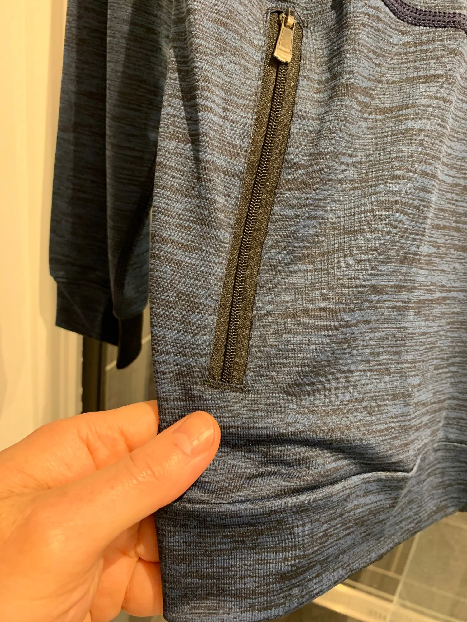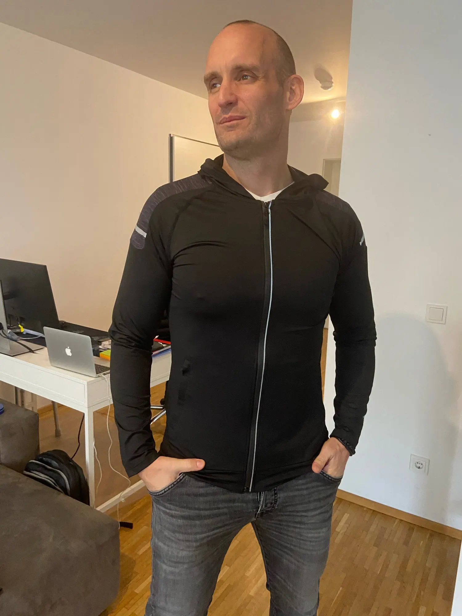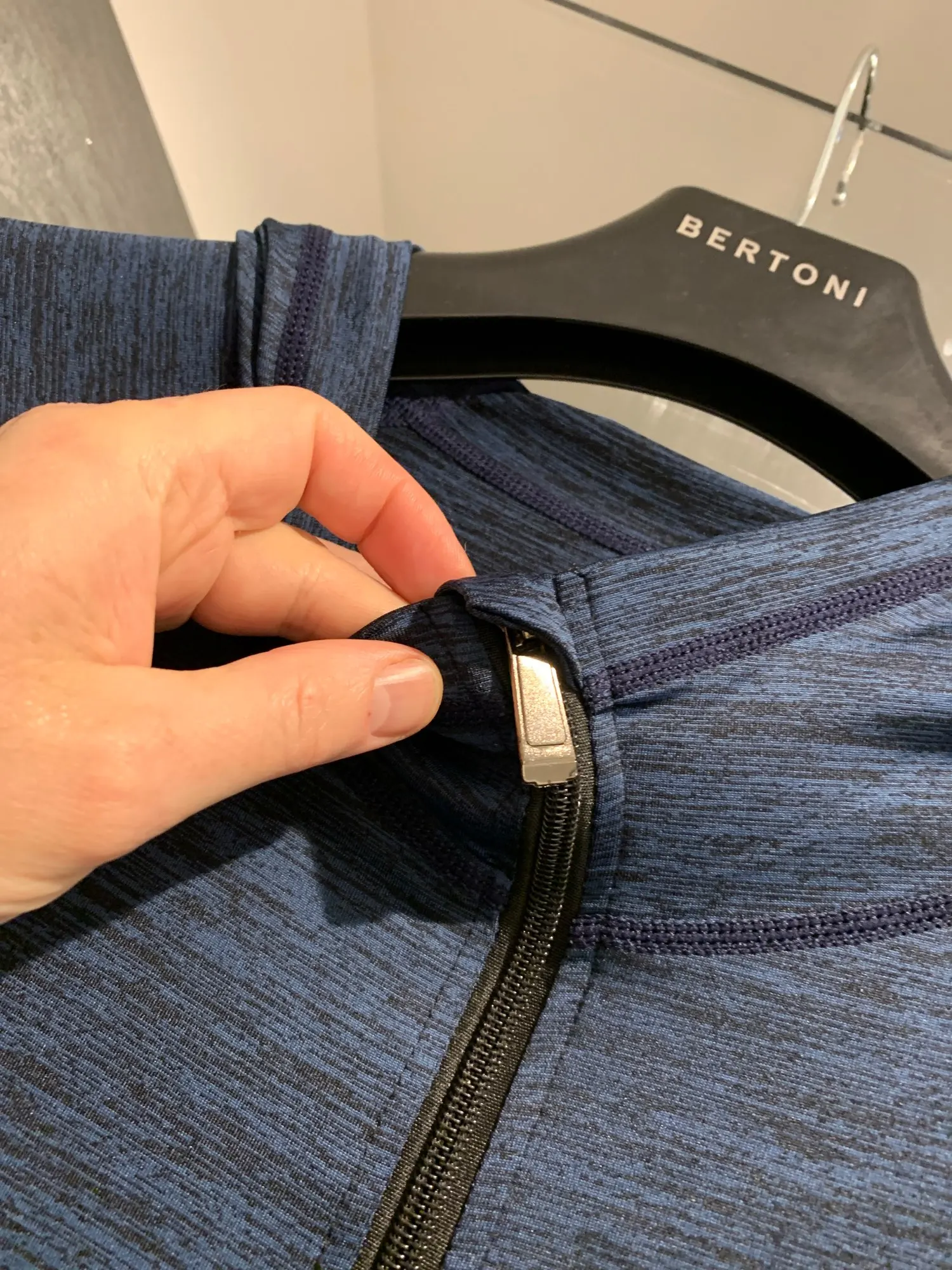 Плюсы: размер соответвует описанию. На свой 48 Ru купил М, все подошло. Еще красивая этикета ) Минусы: На ощупь футболка как будто из старого синтетического материала типа нейлона, а не полистера. Пошита небрежно. Прилагаю одно фото с нижней частью молнии, где вино, как криво пришита ткань под молнией. В других местах тоже торчат нитки. Фасон неудобный: воротник не прилегает достаточно плотно к шее, как бывает на других лонгсливах, а болтается очень свободно и некрасиво. Капюшон безразмерный и без завязок. В общем, второй раз точно не купил бы. И эту не знаю, куда использовать с таким качеством - для бега не пойдет из-за неправильного воротника, для походов - из-за синтетического материала, в котором будешь потеть.