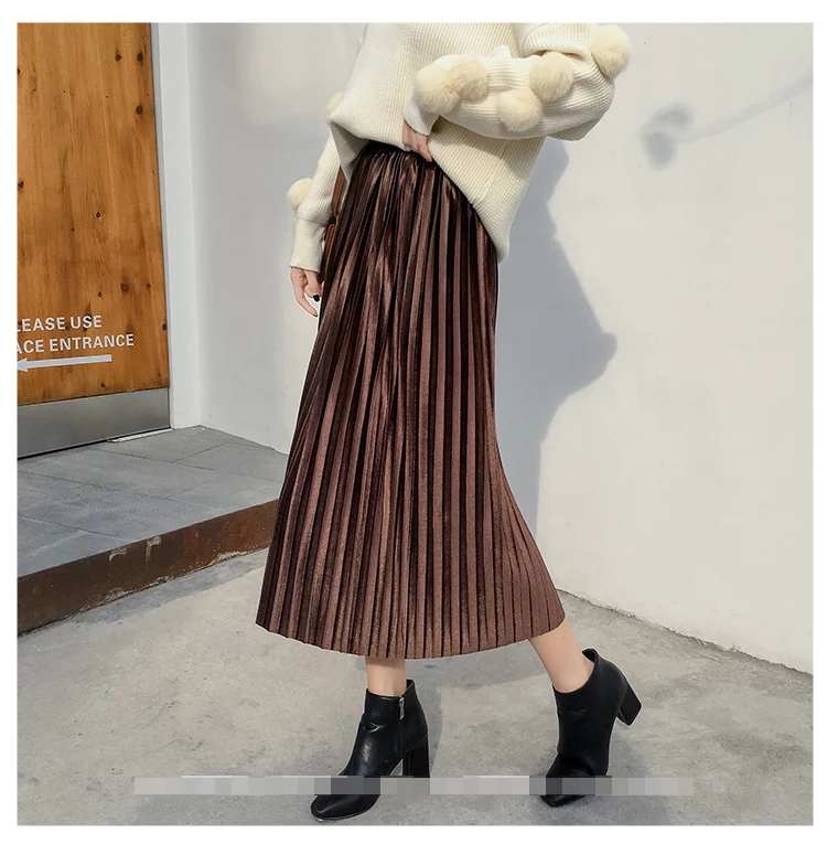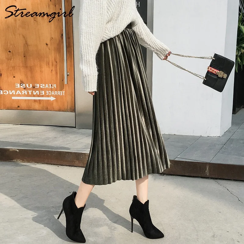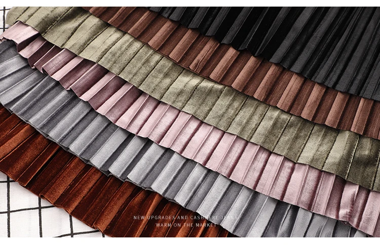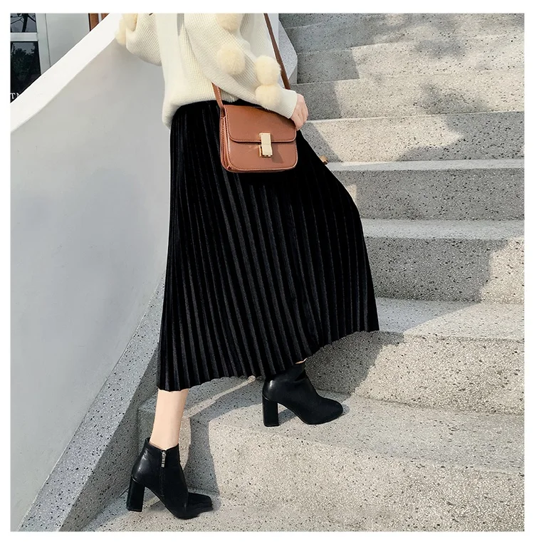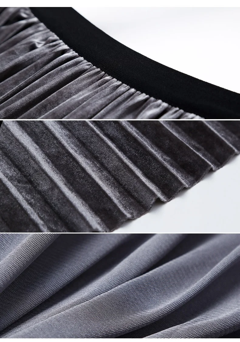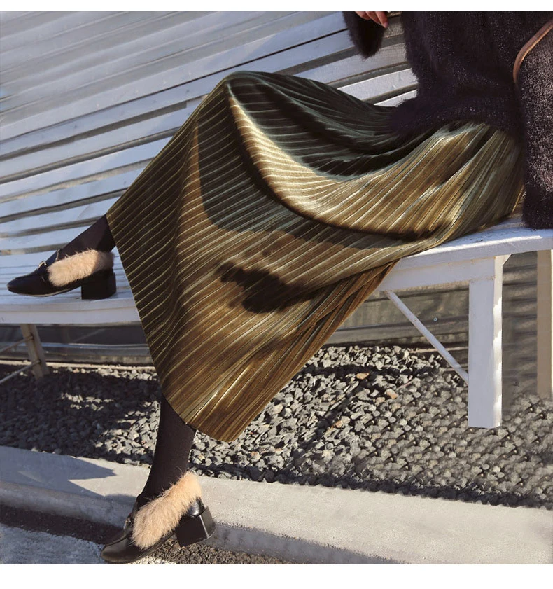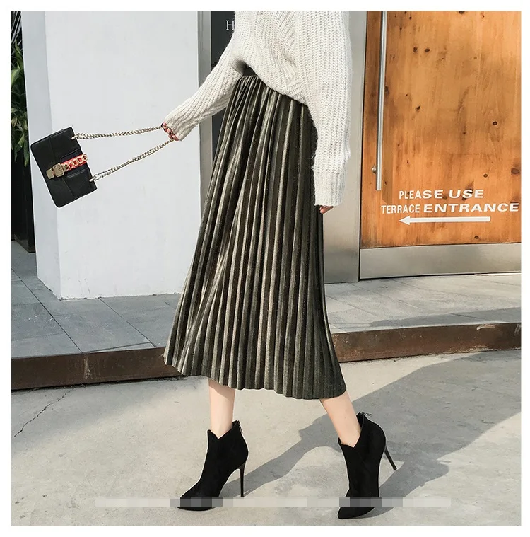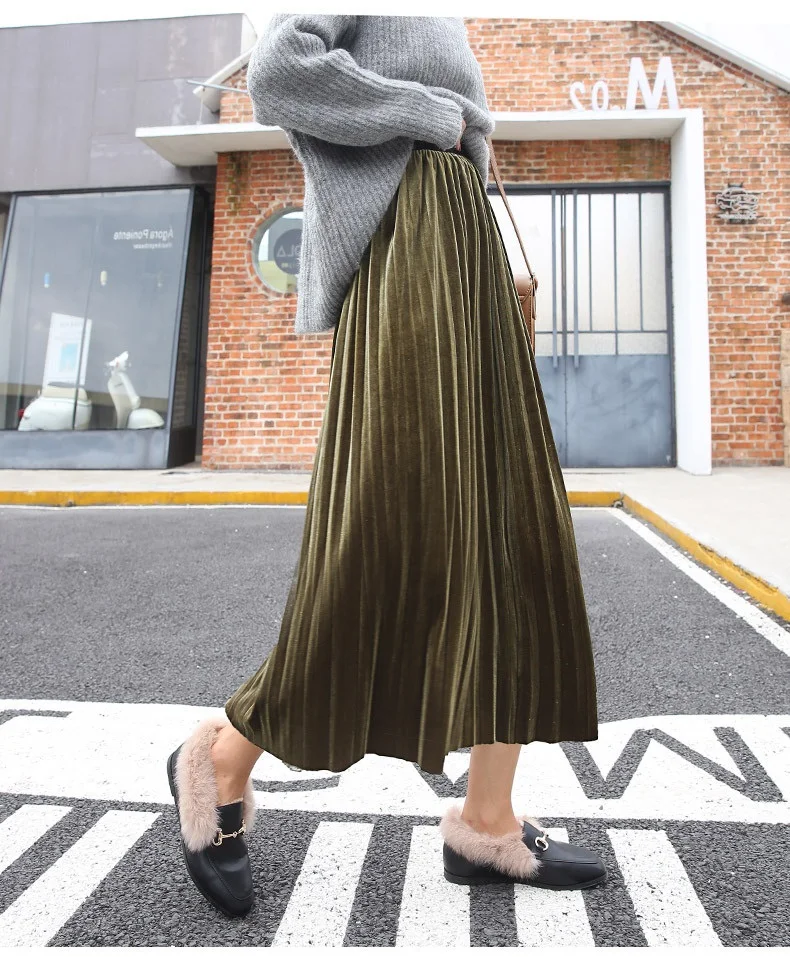Женская плиссированная юбка макси, винтажная длинная бархатная юбка трапециевидной формы зеленого цвета для осени и зимы
