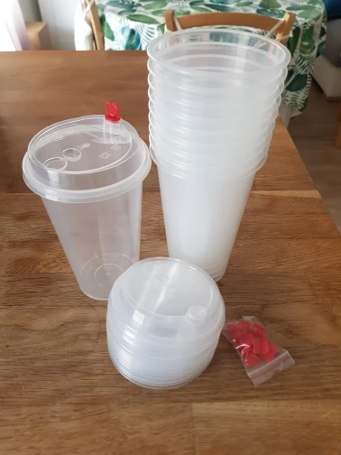 Kit de 10 gobelets à bubble tea avec couvercle et paille. C'est très pratique et le prix est bas mais il y a un problème avec le couvercle qui se referme mal. J'avais déjà acheté un lot la dernière fois et je n'avais pas eu ce problème.