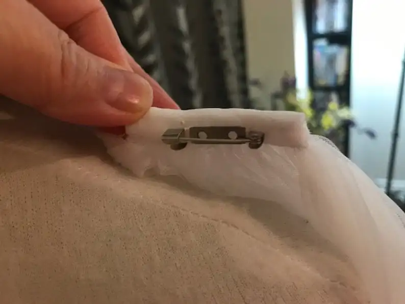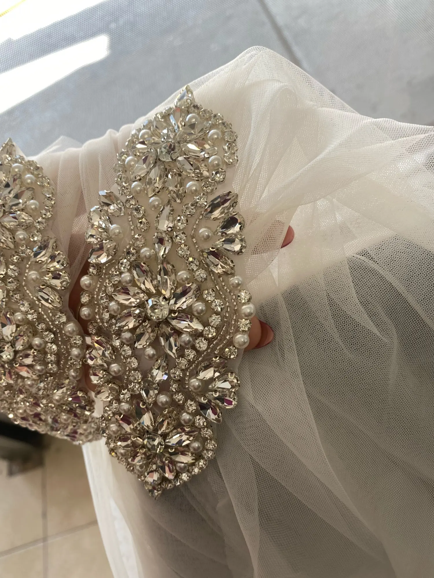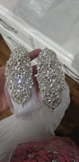 Vraiment magnifique, tulle de belle qualité, couleur champagne parfaite pour ma robe, rendu spectaculaire, j’adore, merci ! Par contre, il faudrait une deuxième épingle à nourrice de chaque côté pour tenir l’avant de l’applique de bijoux pour qu’elle reste bien plaquée à la robe…