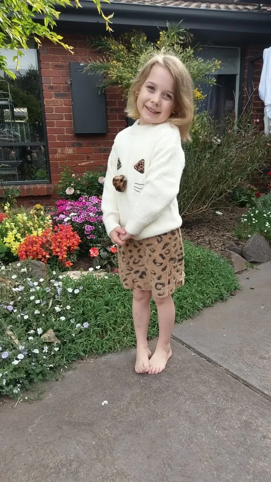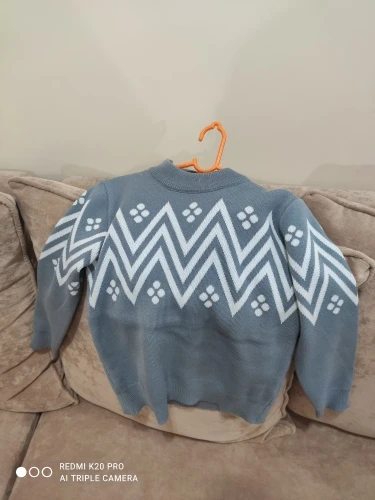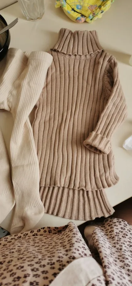 Туника тепленькая не плохая. Как платье не подходит носить. Перед коротковат, хотя рукава плечи ещё великоваты. Когда дорастём до рукавов, станет свитерком, а не платьем.