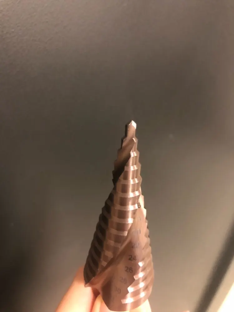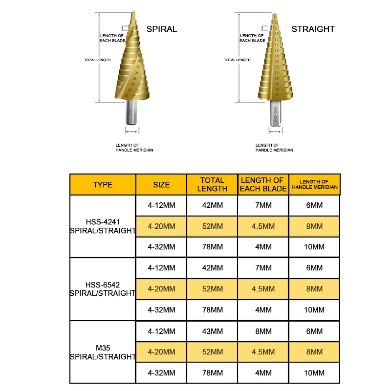 При заказе ошибся: заказал прямые, а хотел заказать спиральные. Написал продавцу и тот по моей просьбе выслал спиральные, за что ему отдельное спасибо. Расстояние между ступеньками: на маленьком (4-12мм) = 7мм, на среднем (4-20мм) = 4.5мм, на большом (4-32мм) = 4мм. Хвостовики: 6мм, 8мм и 10мм соответственно, имеют трёхсторонние срезы от прокручивания сверла в патроне. Качество отличное во всех отношениях!