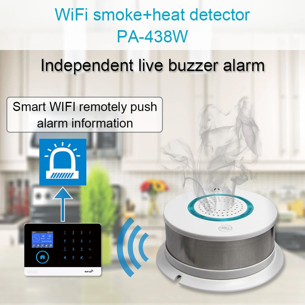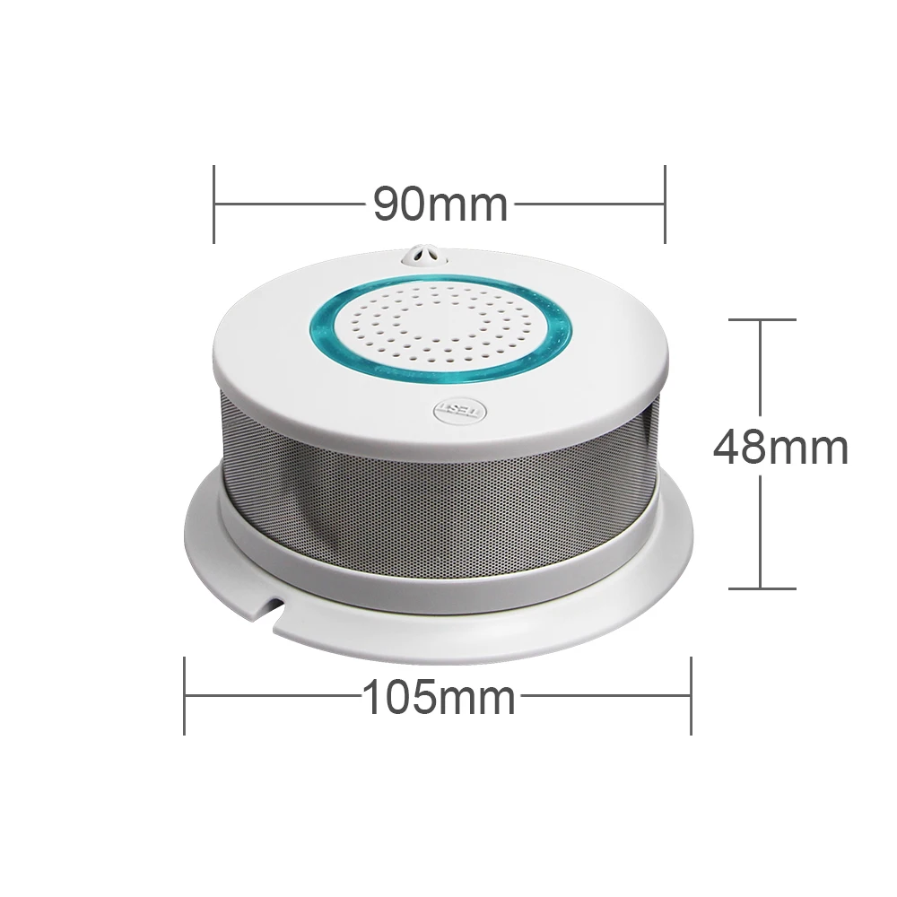 Особенности продукта: Независимый живой звуковой сигнал 1. Высокая чувствительность обнаружения дыма. 2. Встроенный датчик термистора, функция высокотемпературной сигнализации. 3. Умный WIFI удаленно нажимает информацию о тревоге. 4. Умное управление приложением. 5. С Ручным тестированием, отключением звука вручную. 6. Звуковой сигнал и светильник.