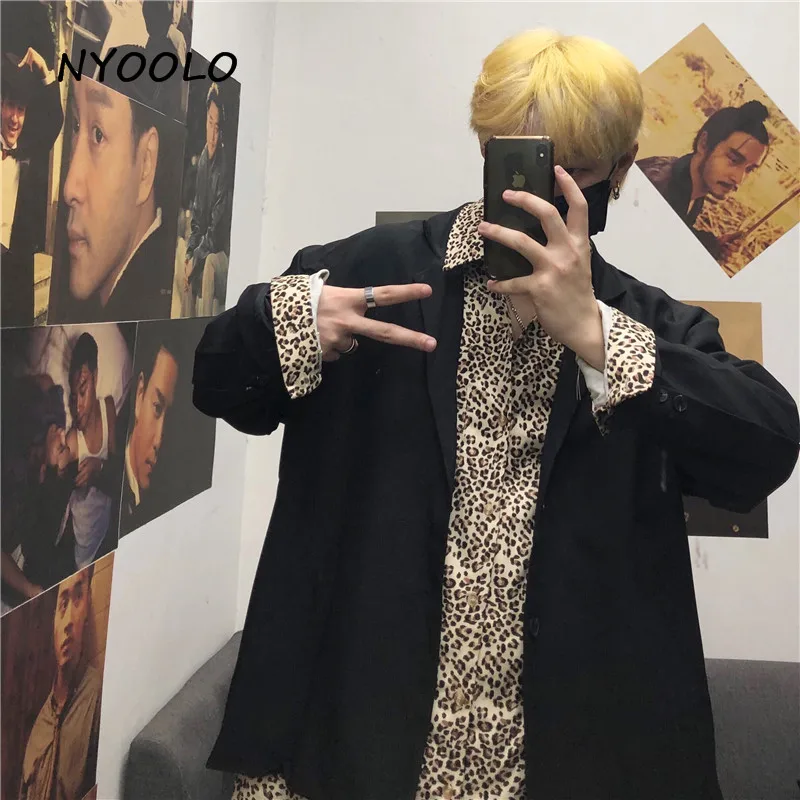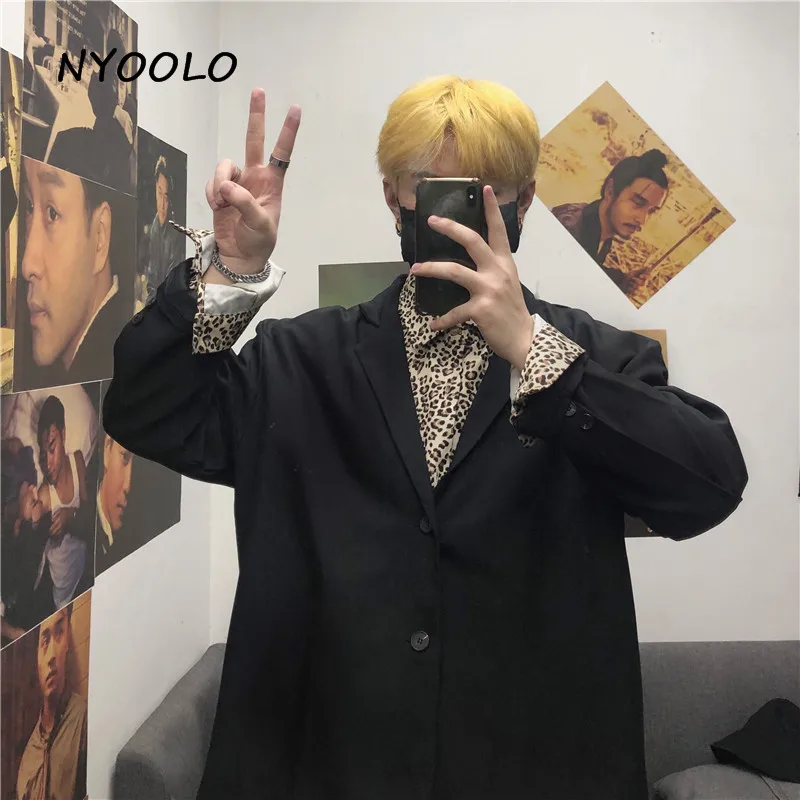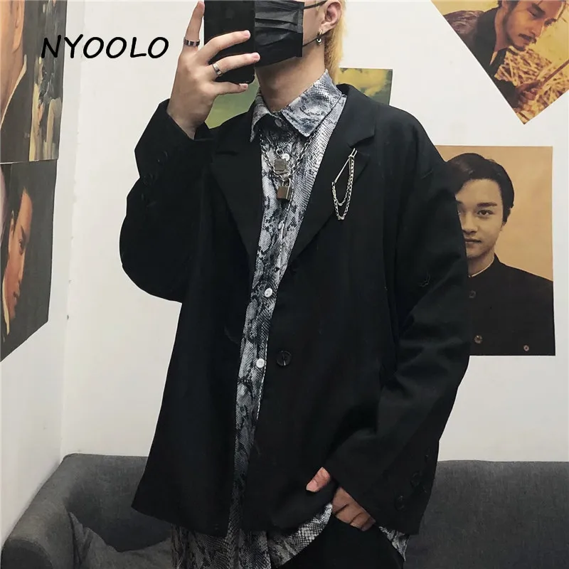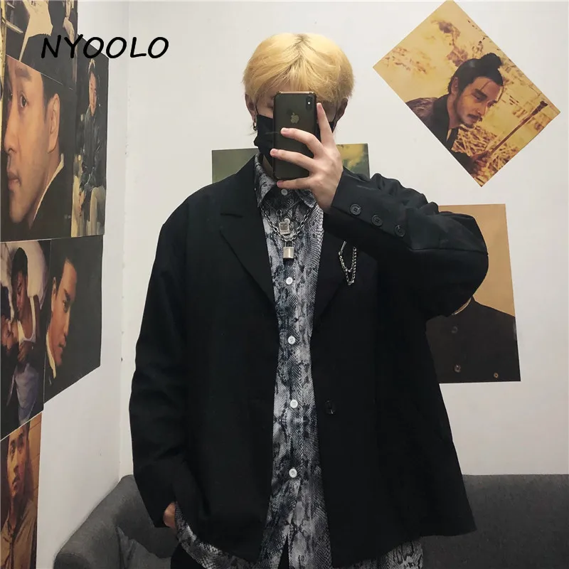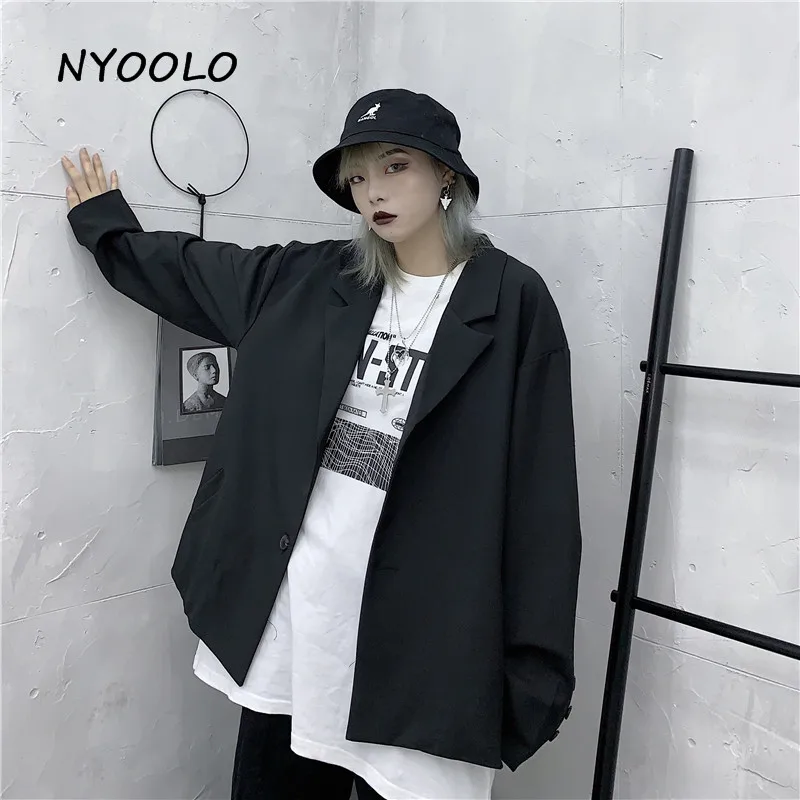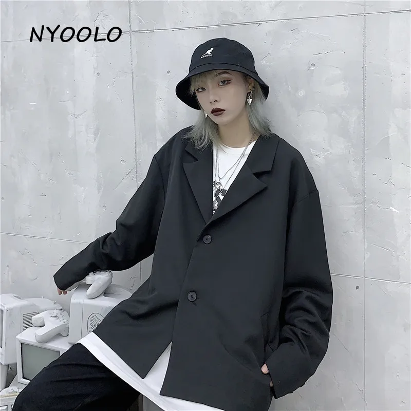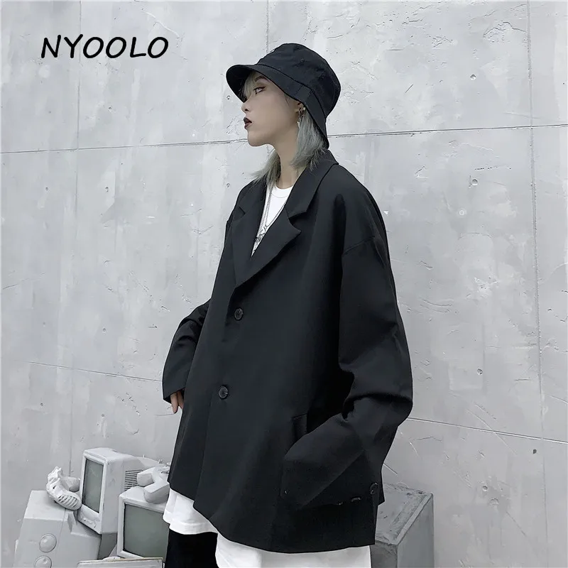 Винтажный однобортный черный блейзер NYOOLO в стиле Харадзюку, осенняя уличная одежда, Свободное пальто с длинным рукавом для мужчин и женщин, верхняя одежда