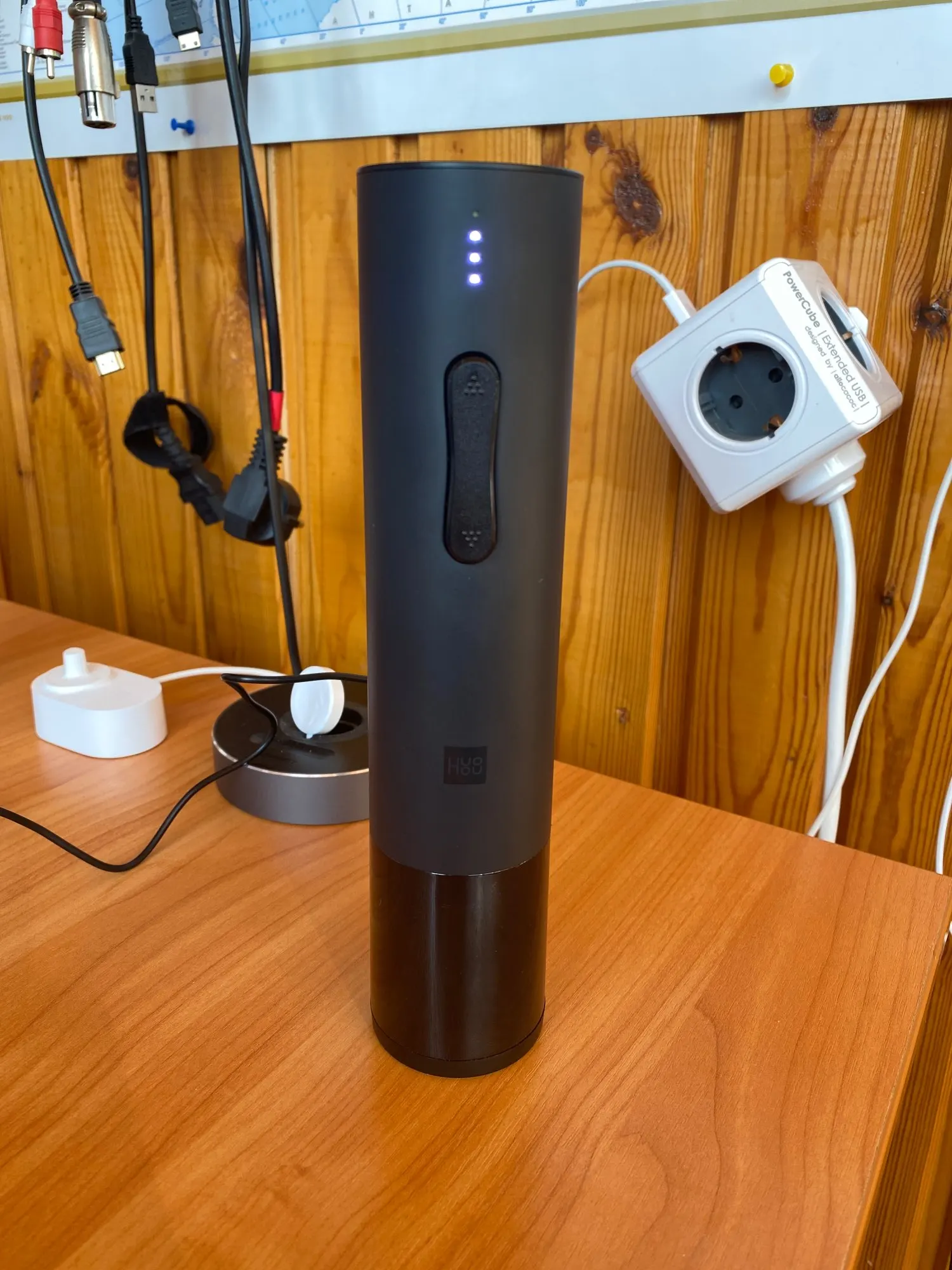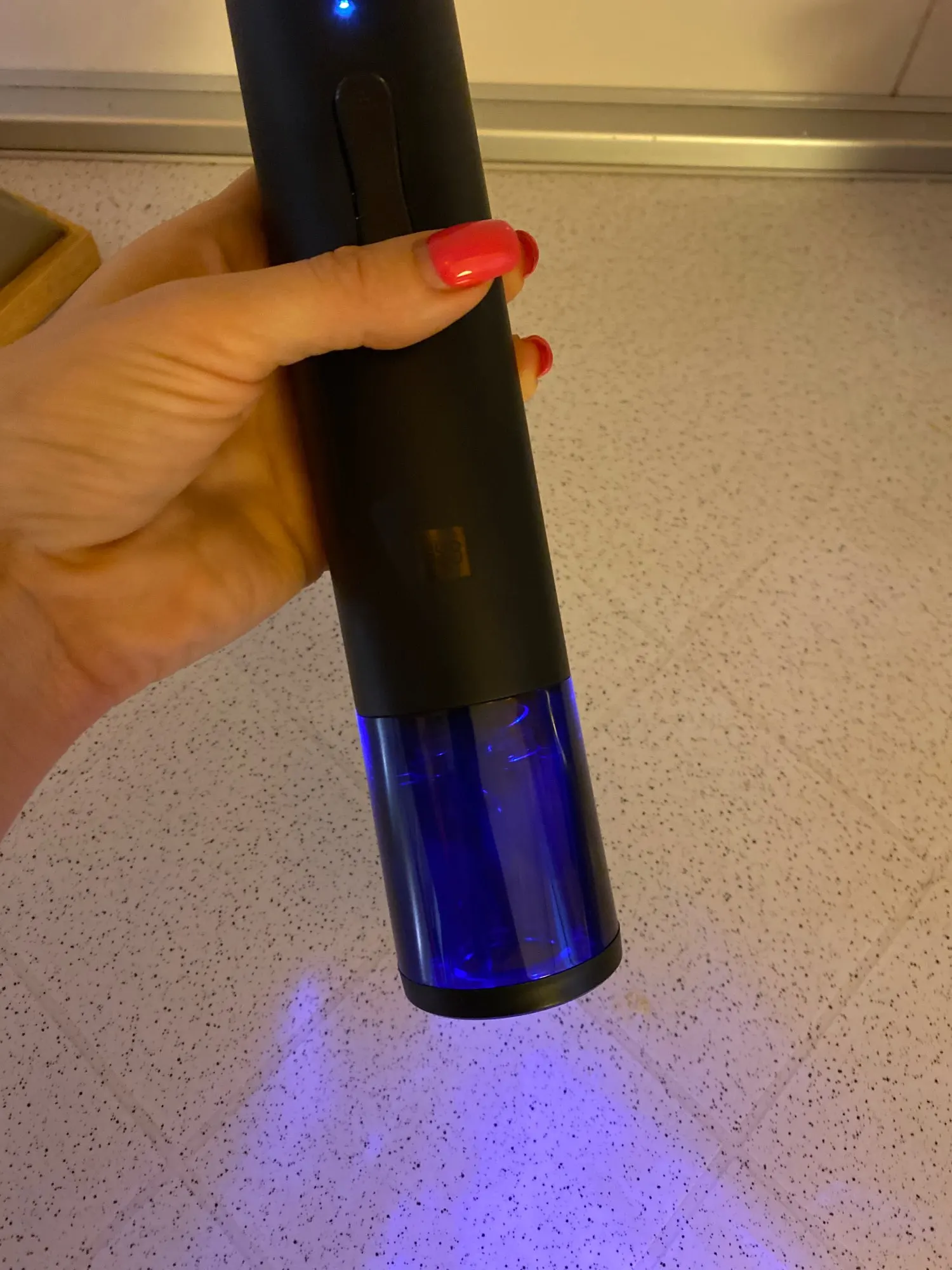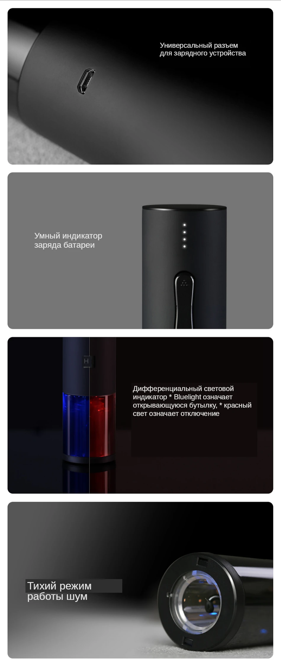 Штопор сделан хорошо. Великоват в длину, но терпимо. Есть световая индикация хода штопора - удобно. Немного моторчик медленный, но все работает. Заряд держит.