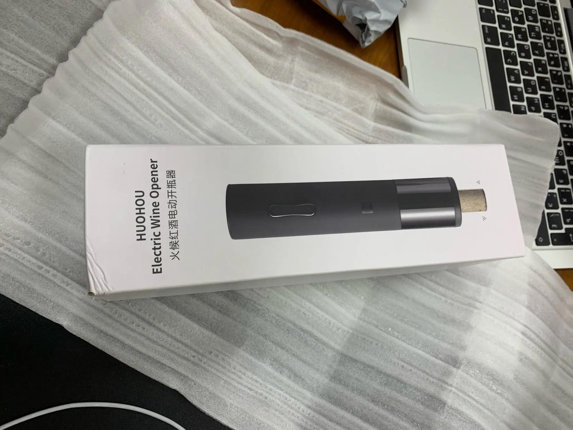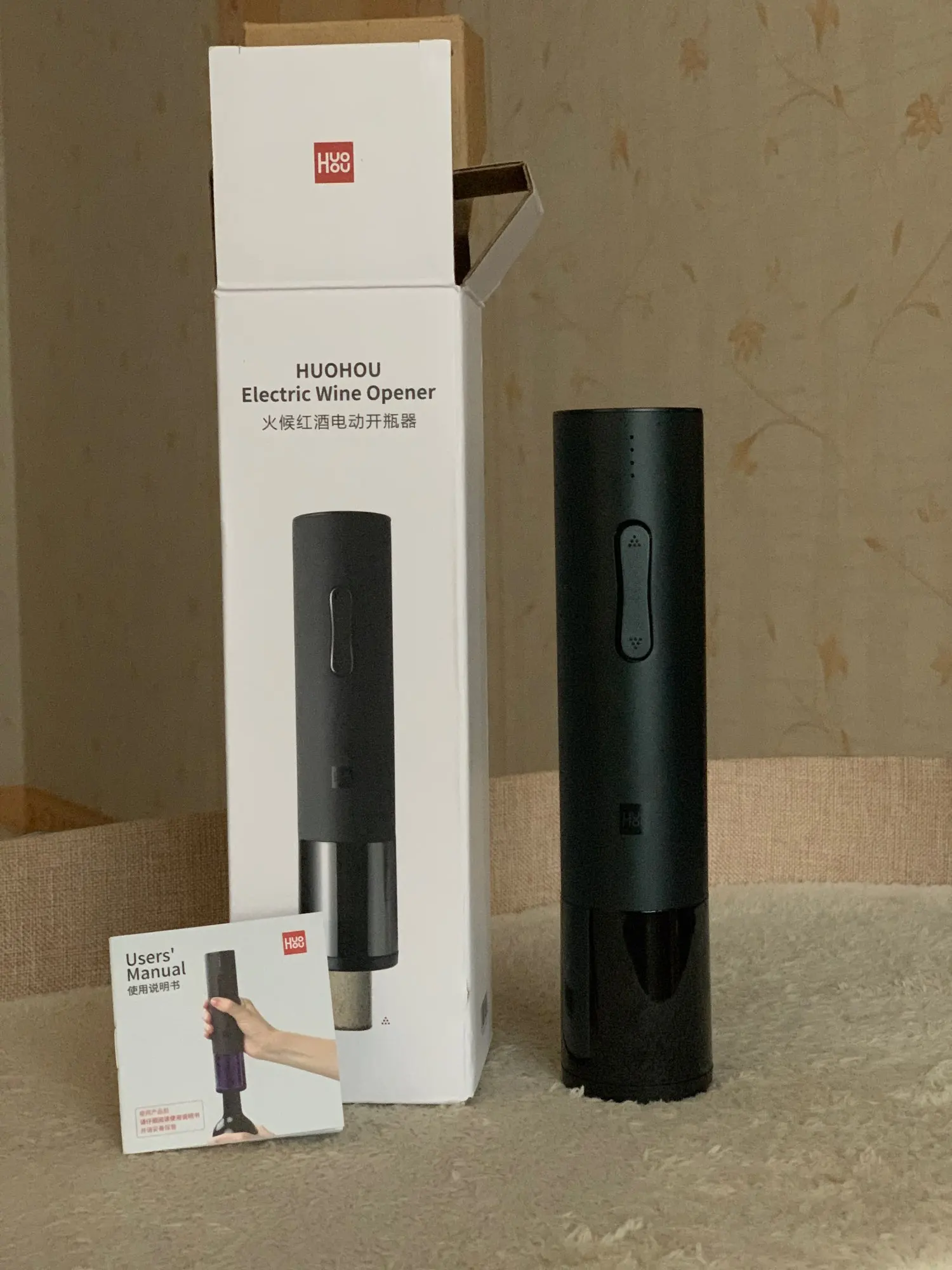 Курьер доставил домой через 2 дня! Супер! Сам штопор очень хорошо выглядит, не большой, удобно держать в руке, не тяжёлый, но и не лёгкий, сделан очень хорошо. Пришёл заряженный, вроде работает, но пробку пока не открывала (не было повода))) , в комплекте небольшая инструкция на английском и китайском языках, зарядка USB и устройство для срезания фольги с бутылки. Я очень довольна. На подарок будет супер.