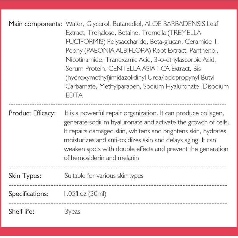 Основные компоненты: вода, Глицерол, бутандиол, экстракт листьев алоэ BARBADENSIS, Трегалоза, бетаин, тремелла (Tremella FUCIFORMIS) Polysaccharide, бета-глюкан, керамид и, пион (paeal BIFLORA) экстракт корня, пантенол, никотинамид, Транексамовая кислота, 3-о-этиласкорбиновая кислота, сывороточный белок, центеллаазиат экстракт, бис (гидроксиметил) ureуреа/buбутилкарбамат, метпарабен, Гиалуронат натрия, DisodiumEDTA Характеристики: I.05fl. oz (30 мл) Срок годности: 3 yeas