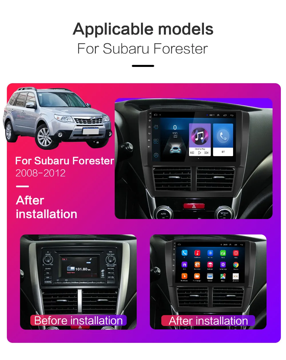 Для Subaru Forester 3 SH 2007 2008 2009 2010 2011 2012 2013Для Subaru Impreza 2007 2008 2009 2010 20111. Операционная система Android может установить приложение Google Play store Skype Facebook youTube Twitter и т. Д.2, 4-х ядерный конфигурация включает в себя (Оперативная память + Встроенная память): 1 Гб + 16 ГБ/2 ГБ + 16 ГБ/2G + 32G [дополнительно]3, 8-ядерный конфигурация включает в себя (Оперативная память + Встроенная память): 7216-1 г + 32 г/7216-2 г + 32 г/7216-4 г + 64 г/7216-6 г + 128 г/7216-8 г + 128 г/4G-SIM-5716-2G + 32G/4G-SIM-5716-4G + 64G/4G-SIM-5716-6G + 128G/4G-SIM-5716-8G + 128G [опционально]4, 4-ядерный содержит: версия: Android 9,0Разрешение: HD TN; 1024*600; Не поддерживает функцию AM и RDS;5, 8-ядерный содержит: версия: Android 10;Разрешение: HD IPS,7216-WIFI версия: Поддержка DSP, FM, RDS ,16EQ, HIFI, сплит-экран, двойная запись спереди и сзади и 360 панорамных функций камеры; Не поддерживает видеовыход;Ядер заключаются в следующем: 4-х ядерный Процессор и 4-х ядерный графический процессор4G-SIM-5716-WIFI версия: 8-ядерный, поддерживает DSP, FM, RDS, Hi-Fi, Разделение экран, спереди и сзади двойная запись и 360 панорамная камера функции; Не поддерживает видео выход;6. Поддержка: радиостанция, Bluetooth Вызов, Bluetooth музыка, управление рулевым колесом, встроенный WiFi, MP3, видео музыка (MPG, AVI), навигация, видеовыход, зеркальная связь, USB 4G LTE WIFI ключ и другие функции; Поддержка выбора логотипа автомобиля; Sfactory пароль: 8888