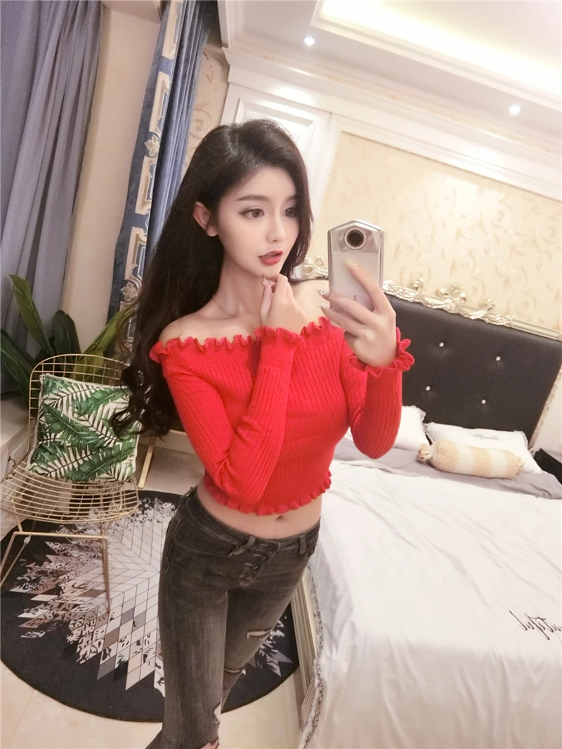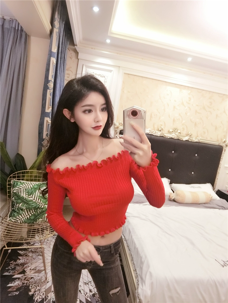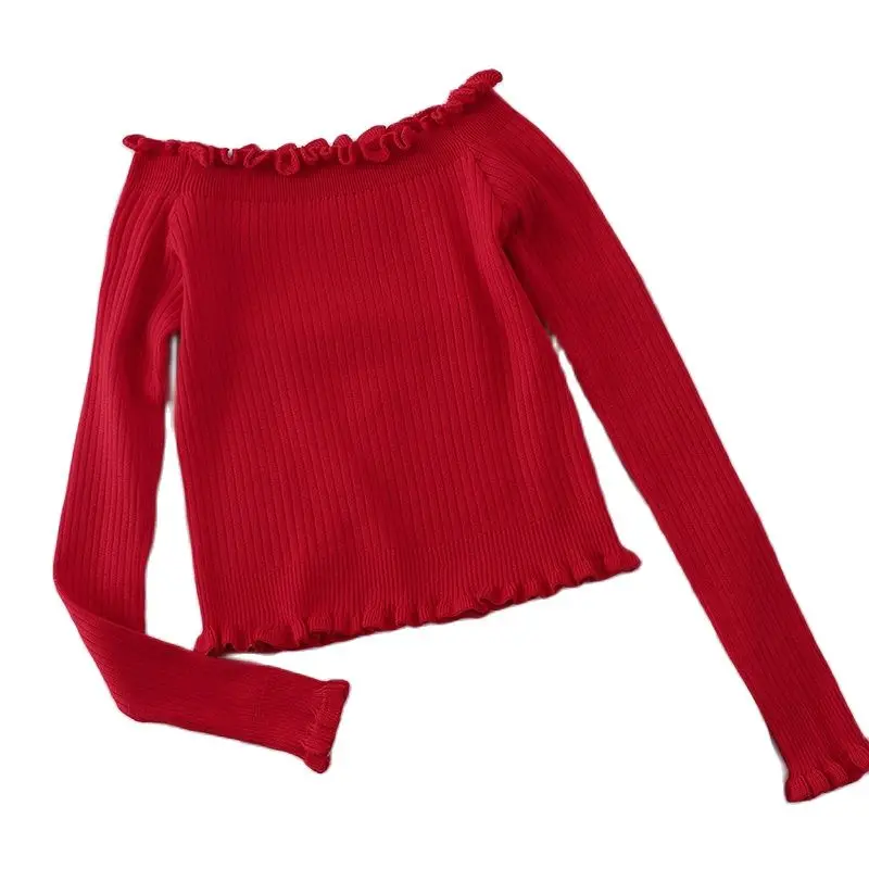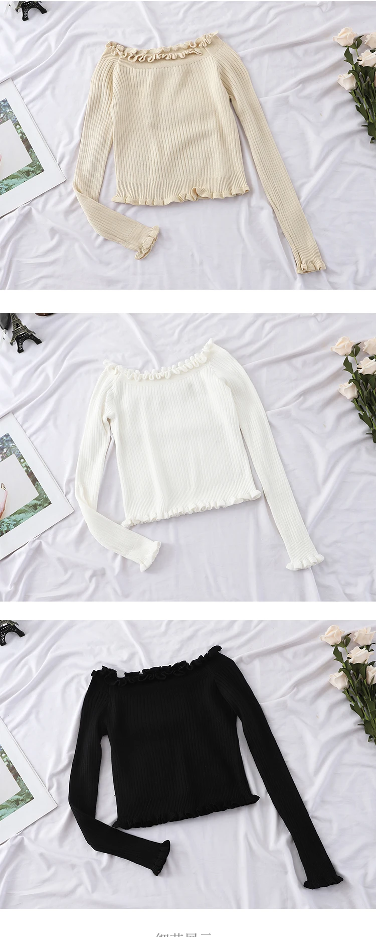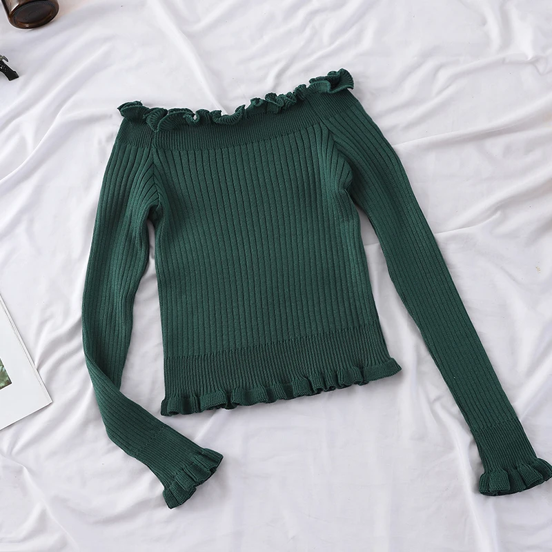 Джемпер женский трикотажный с открытыми плечами, длинными рукавами и оборками на подоле, осень 2020