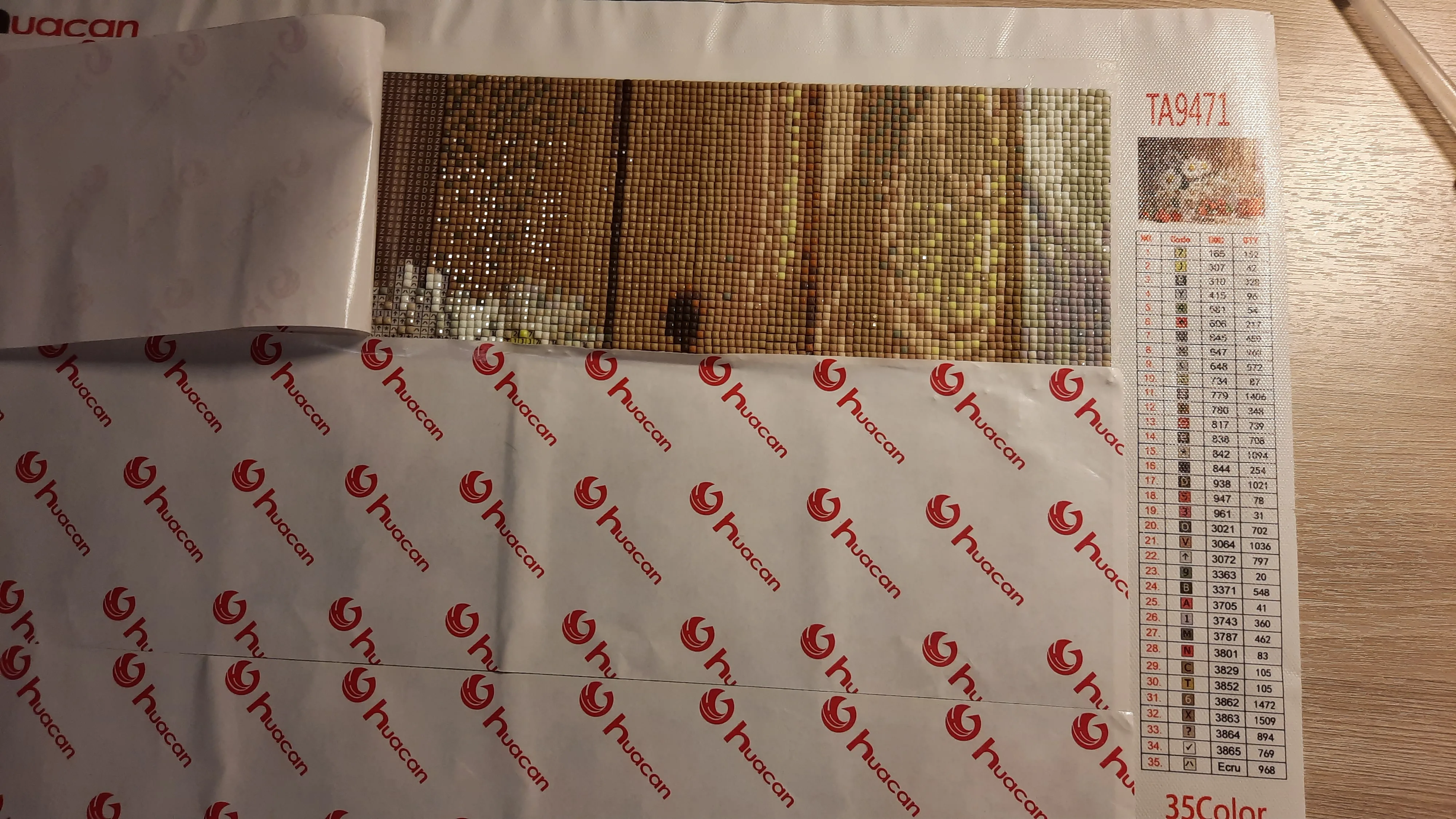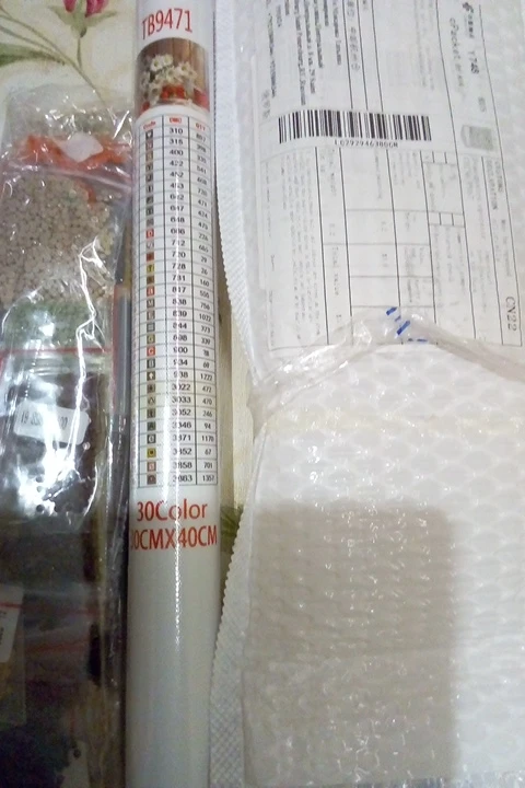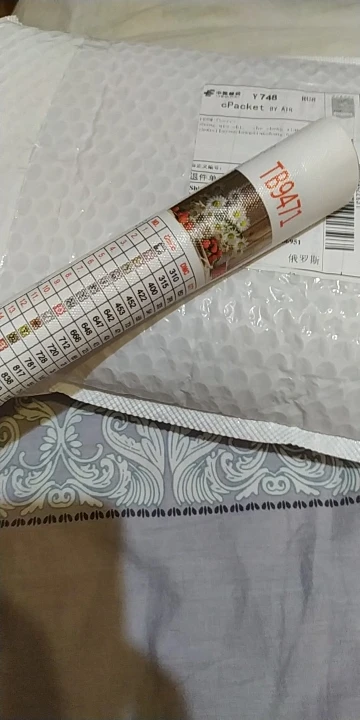 Самая быстрая посылка с Алиэкспресс, шла меньше месяца. Очень хорошо упоковано, сама картина накручена на валик, ни каких складок. Один минус что липкий слой покрыт белой бумагой, а не пленкой.
