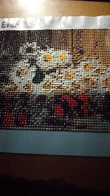 заказала 30.11 получила 27.12. собирается легко. на фото ярче цвета,чем на самом деле! если собрать в тех цветах,что предлагает продавец,то будет очень серо,тускло и грустно! буду менять стразы на более яркие(остались от преждних картин). в частности ромашки(они будут белыми, как и положено). в целом хороший товар! продавцу рекомендую пересмотреть цвета картины!!!
