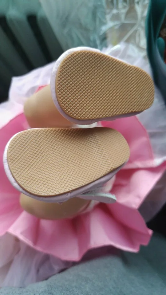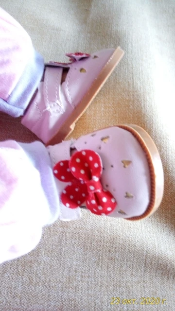 Туфельки просто прелесть! Шли около месяца, трек-номер отслеживался. Заказала на старинную Советскую куклу 53 см, которой играла ещё моя бабушка (теперь доченька). Длина стопы у куклы ровно 7 см,-туфельки еле натянула, оказались немного малы (пяточка слегка выпирает,-на фото видно). Длина стельки 6,5 см. Бантики сразу отвалились,-проклеила их сама. Сандалики вызвали восторг у всех, кто их видел. Такие классные! Очень рекомендую! Супер!