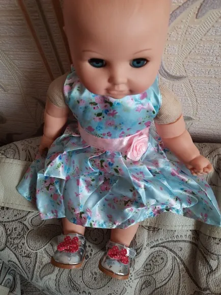 Туфельки подошли кукле Инна фабрика Весна, у неё рост 42 см. Одеваются плотно, на носок не оденутся, а вот на кукол СССР ростом 46 см одеваются свободно с носком. Заказала вторую пару, очень понравились. Платье так же подошло, чуть-чуть расходиться застёжка внизу. Талия 26,5см.