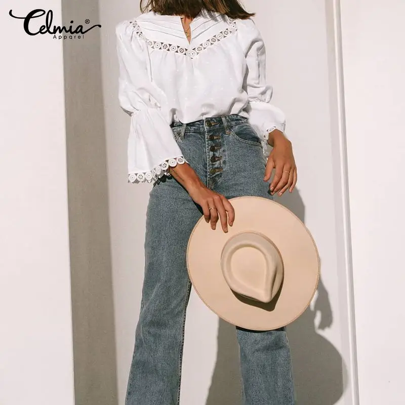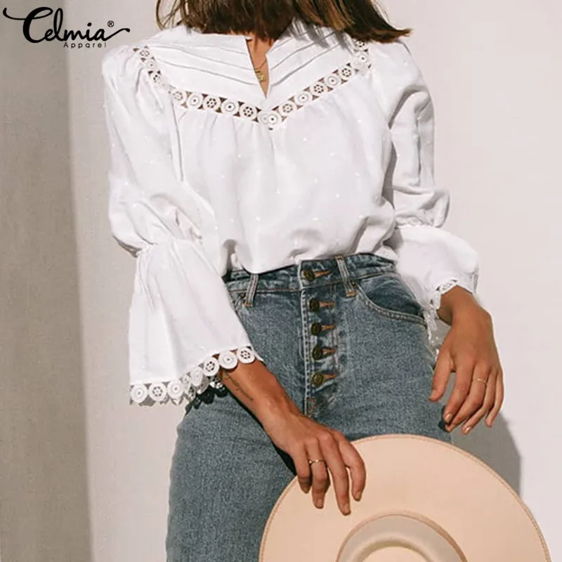 Женская туника, топы, Элегантные Белые блузы с кружевной строчкой cellumia 2019, рубашка с расклешенными рукавами, повседневные свободные блузы размера плюс