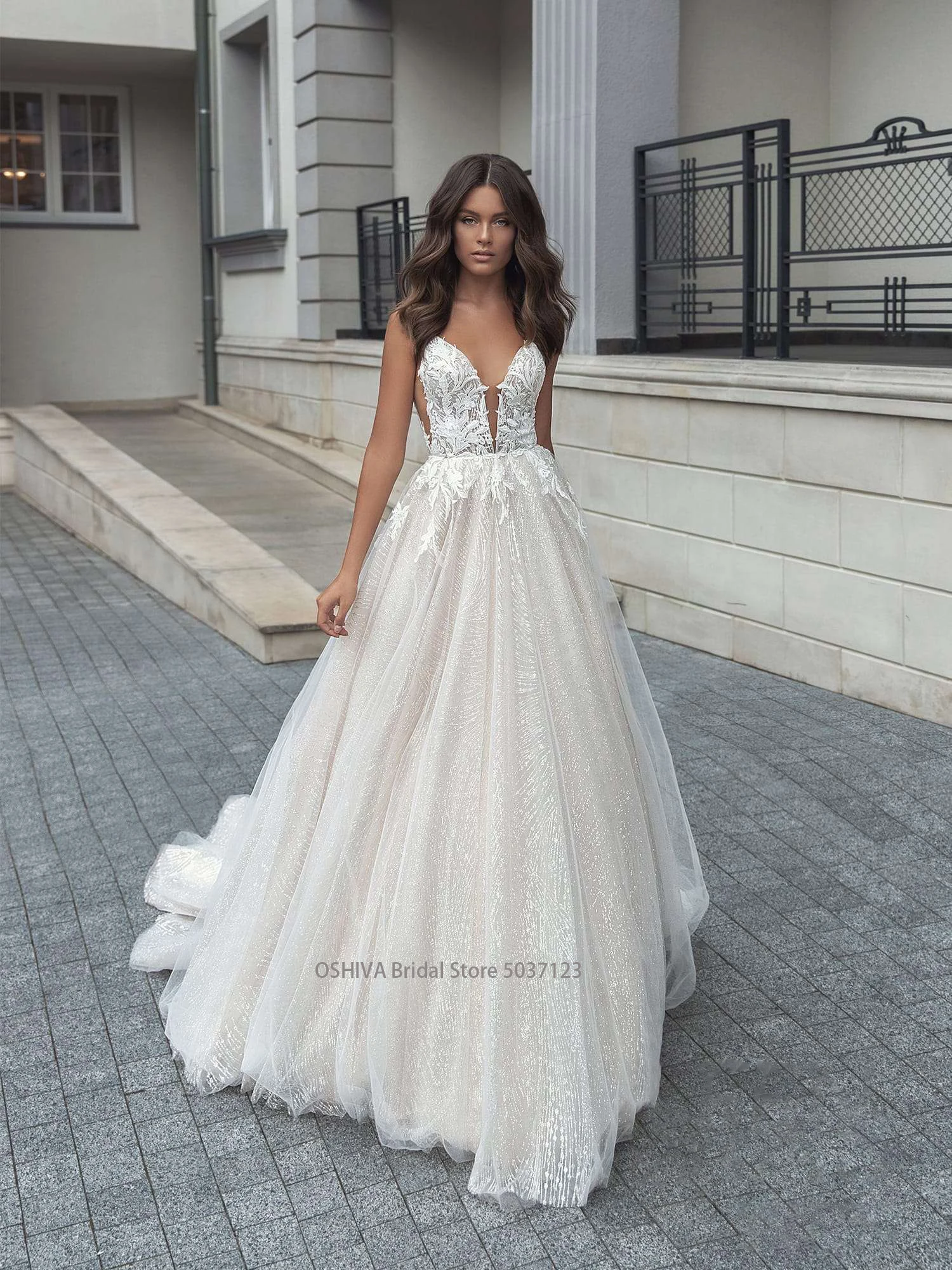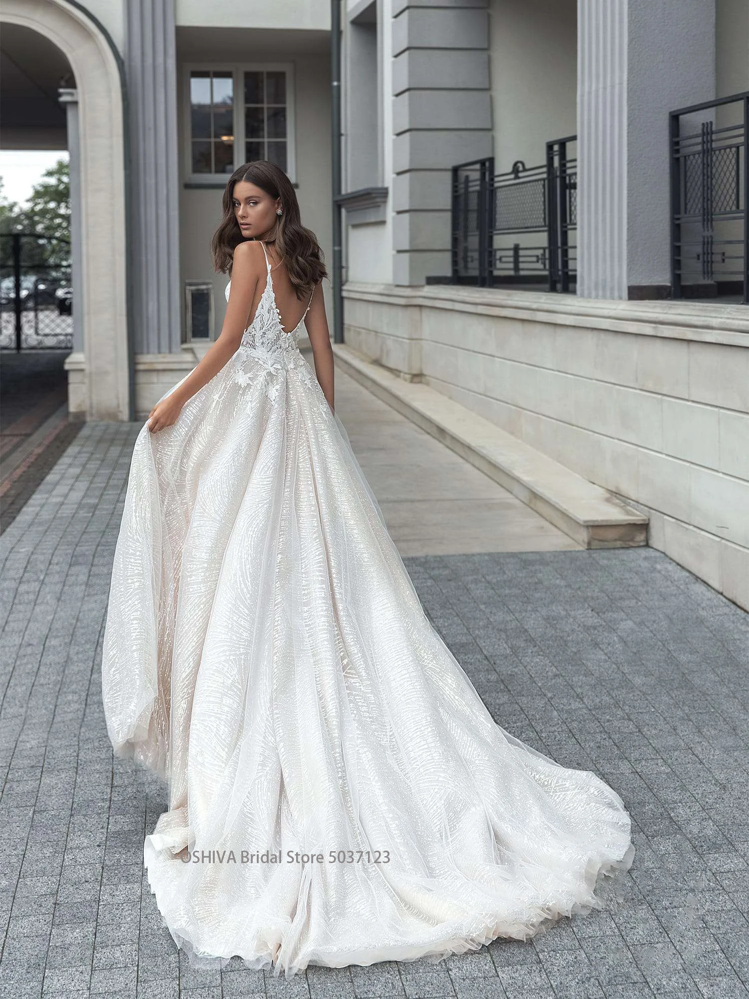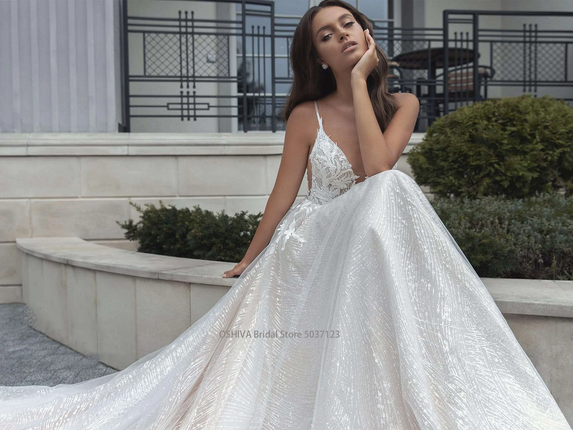 Блестящие трапециевидные Свадебные платья на бретельках, сексуальное блестящее Тюлевое платье с глубоким V-образным вырезом и открытой спиной, свадебное платье со шлейфом, женское платье