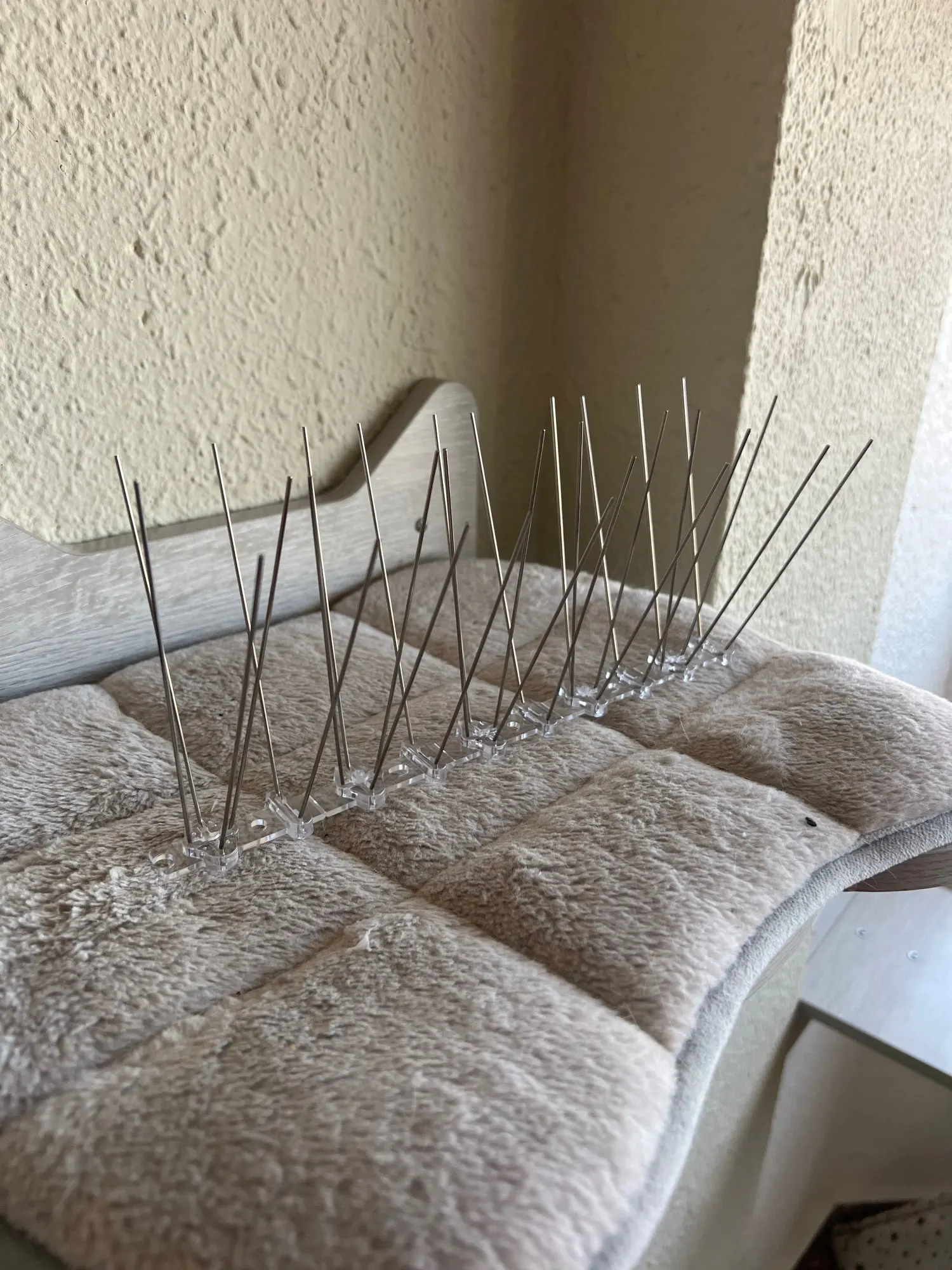 Очень быстро доставили! Шипы в диаметре 1.25мм, после установки выступают на 106мм, приятное качество материал НЕ магнитится Синицы довольны, фото кормушка свободна от голубей сверху!