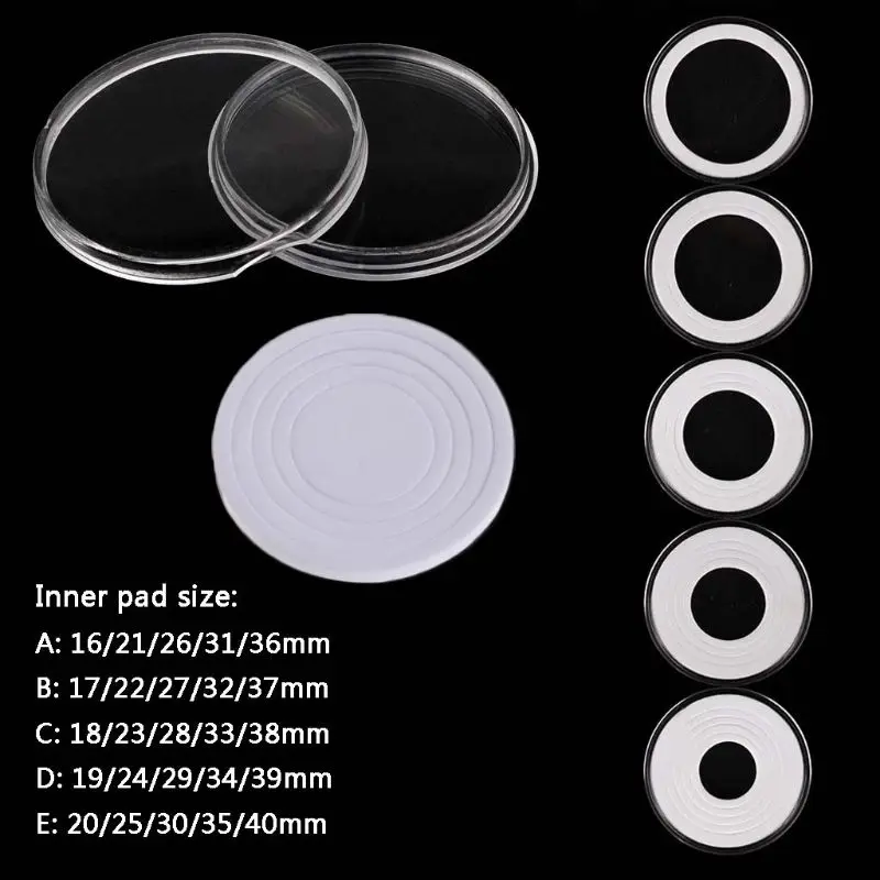 Круглая капсула с внутренним диаметром 46 мм и кольцами для подушек с 5 различными внутренними диаметрами делает этот держатель для монет подходящим для монет 6 разных диаметров.