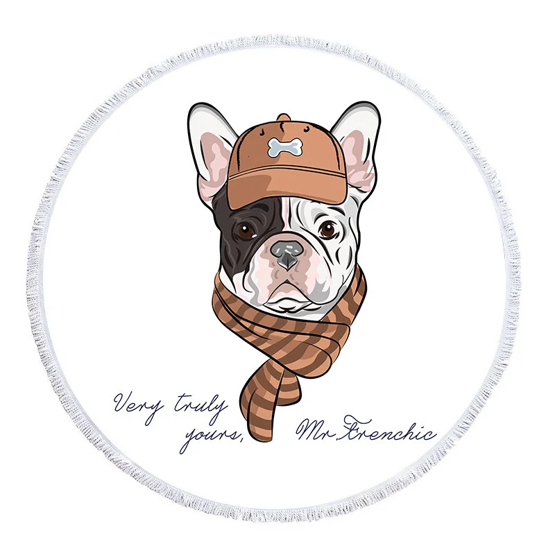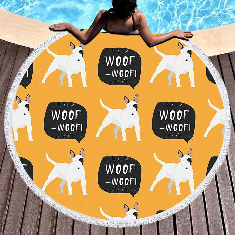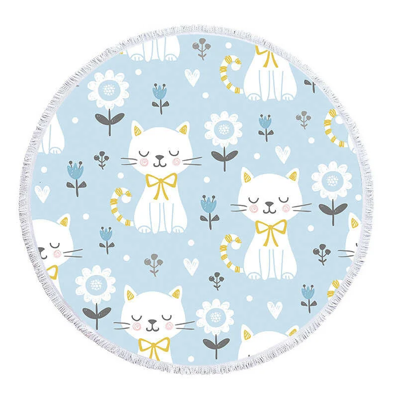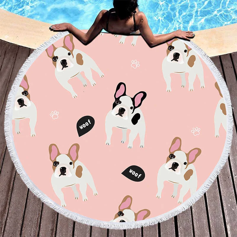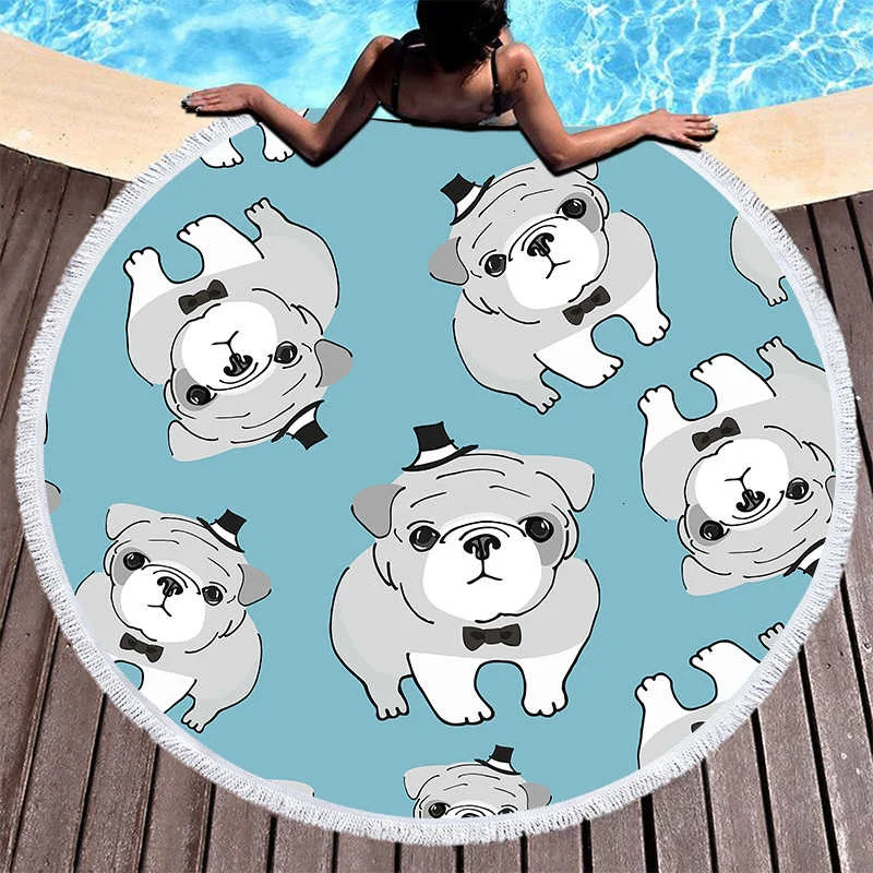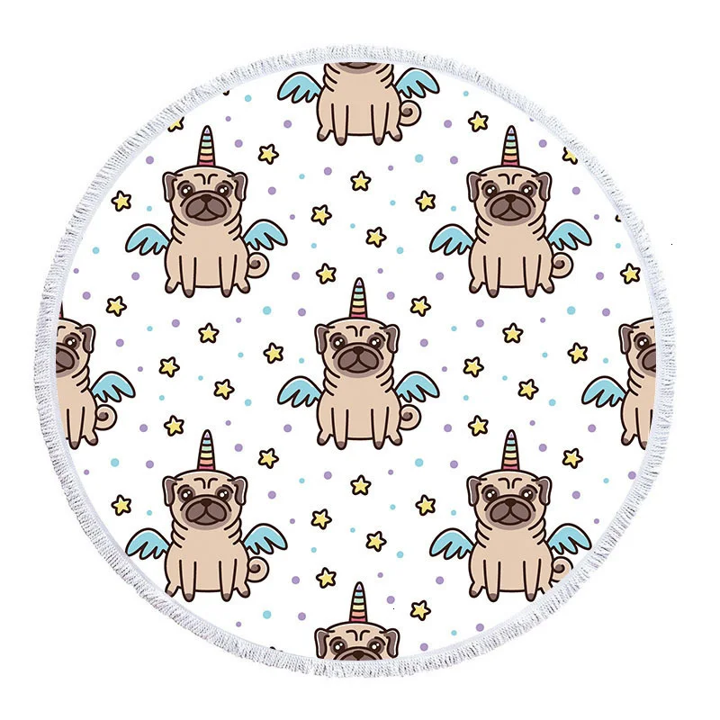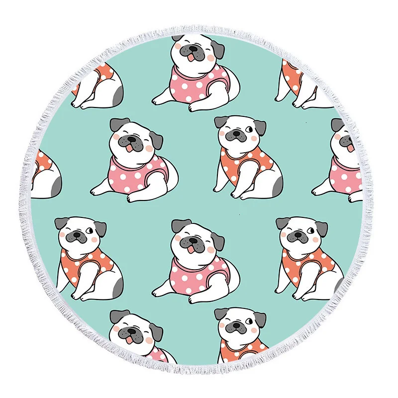 Круглое пляжное полотенце с мультипликационным рисунком мопса, кошки, милые животные с кисточками, микрофибра, 150 см, детские подарки для пикника, коврик для йоги, одеяло, коврик, гобелен
