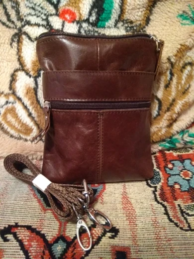 Девочки, кто хочет порадовать мужа или сына, кума или друга, берите не пожалеете!!! Сумочка !!! В реале темненькая а не как иногда получается на фото ярко рыжая! Маленькая, то что надо для сигарет, ключей и маленького лопатника или можно деньги ложить в кармашик под замком, ну и конечно же маски. Зае.... ли они со своим карантин ом! Прилетела быстро!