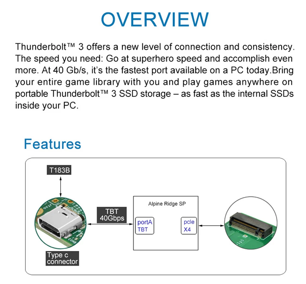 Параметры изделия:Наименование: Коробка ThunderBolt 3 NVMEЦвет: черный, серебристыйСкорость: X4 8,0 GT/sПоддержка: Протокол PCI-E NVME SSD, только для ленточного протокола Thunderbolt 3 (не поддерживает обычный TYPE-C, обычный TYPE-C-USB-протокол)