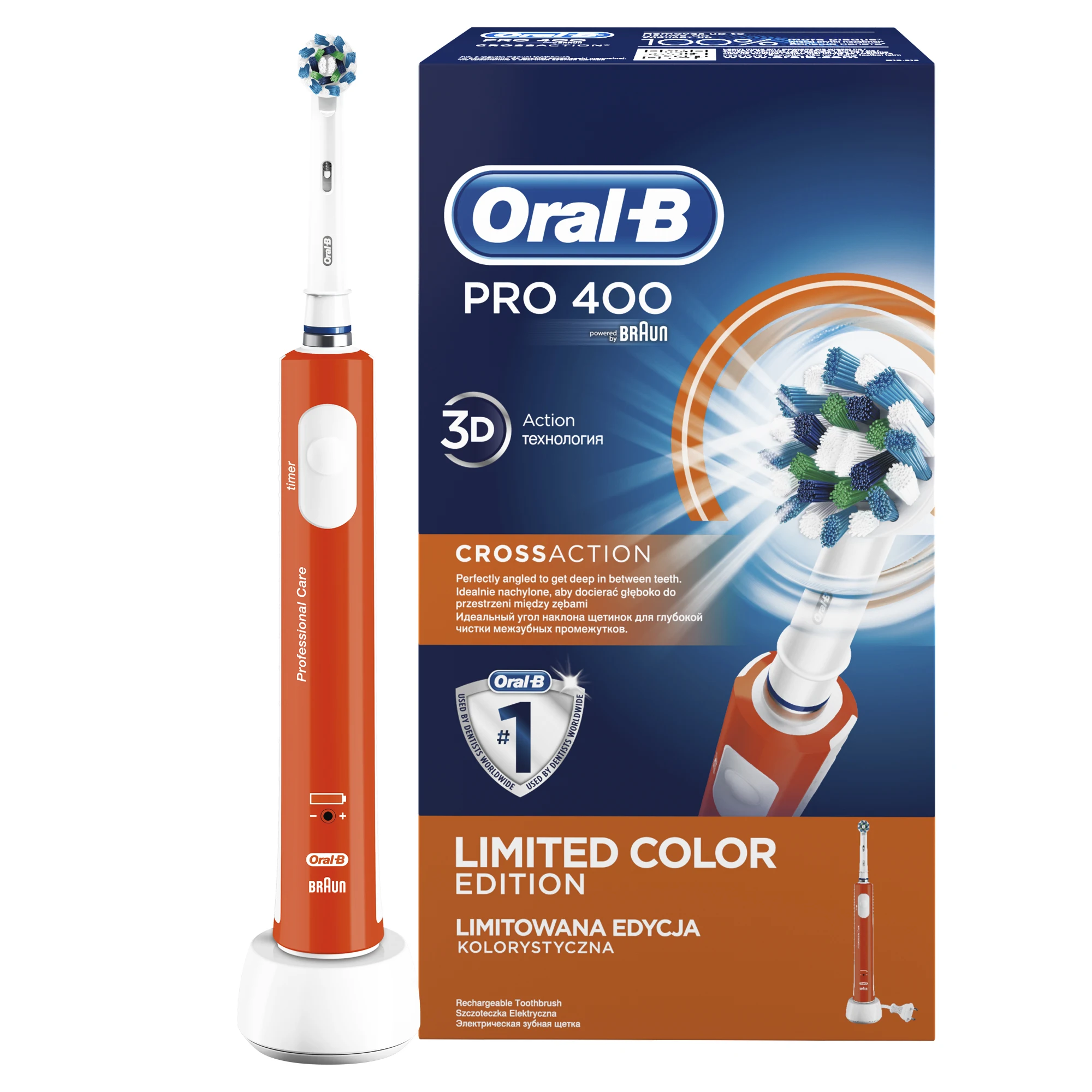 аккумуляторная электрическая зубная щетка оранжевого цвета с 1 режимом чистки: «Ежедневная чистка» (1 шт.), сменная насадка CrossAction (1 шт.), зарядное устройство (1 шт.) Подходит для детей с 3 лет. 8800 возвратно-вращательных движений + 20000 пульсирующих движений. Перейдите на новый уровень чистки за 2 минуты!