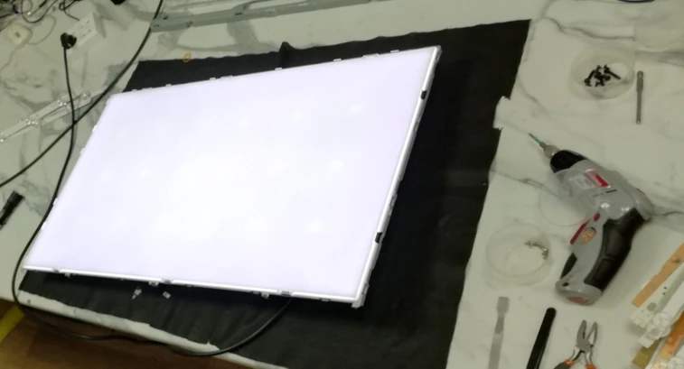 Подсветка работает, но видно круги от светодиодов на заливке. При просмотре контента не мешает.