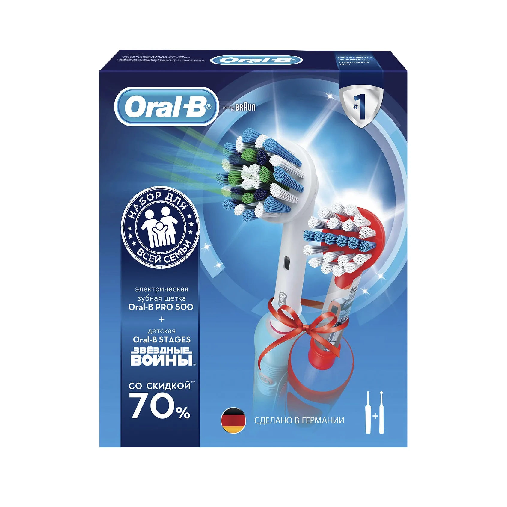 Набор электрических зубных щеток Family Pack (Oral-B PRO 500 и Oral-B Stages Power Звездные войны). Электрическая зубная щетка Oral-B PRO 500 удаляет до 100% больше зубного налета, чем мануальная зубная щетка, а также улучшает состояние десен. Благодаря профессионально разработанному дизайну насадки CrossAction, щетинки, расположенные под углом, окружают каждый зуб, бережно удаляя налет даже из труднодоступных мест и вдоль линии десны.