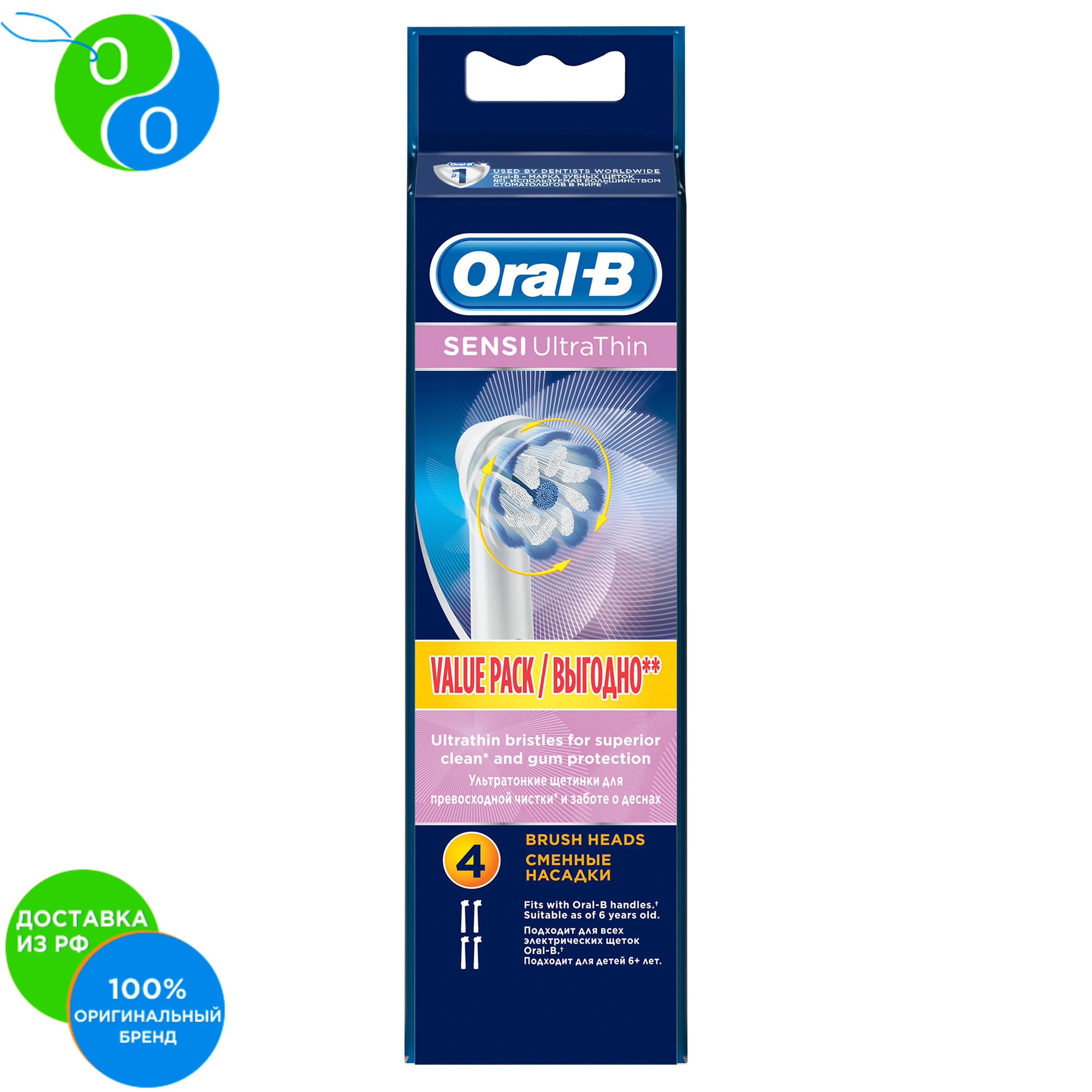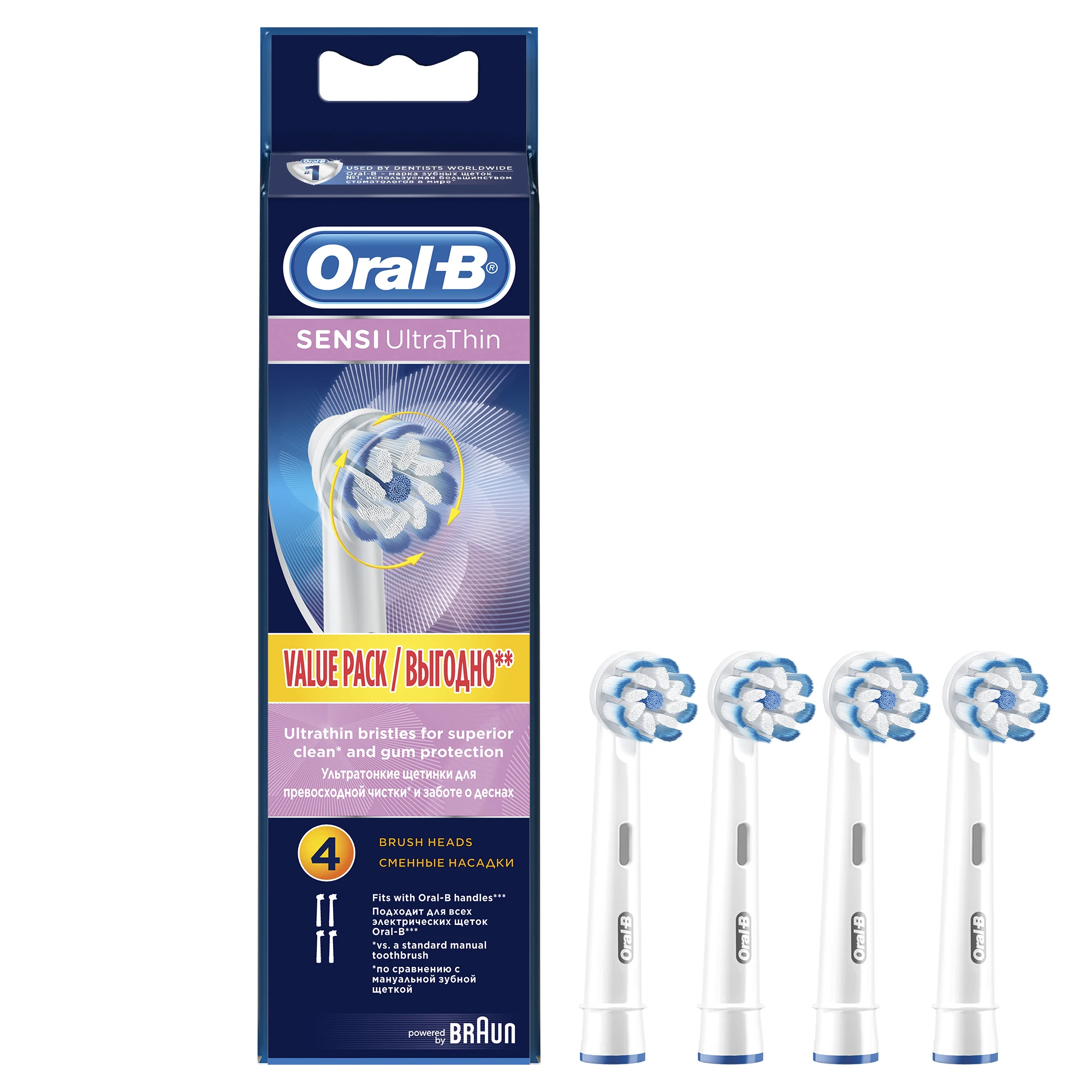 В комплект входят 4 сменные насадки для электрической зубной щетки Oral-B Sensitive Ultrathin.