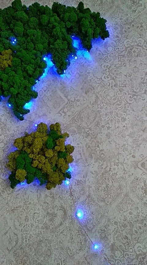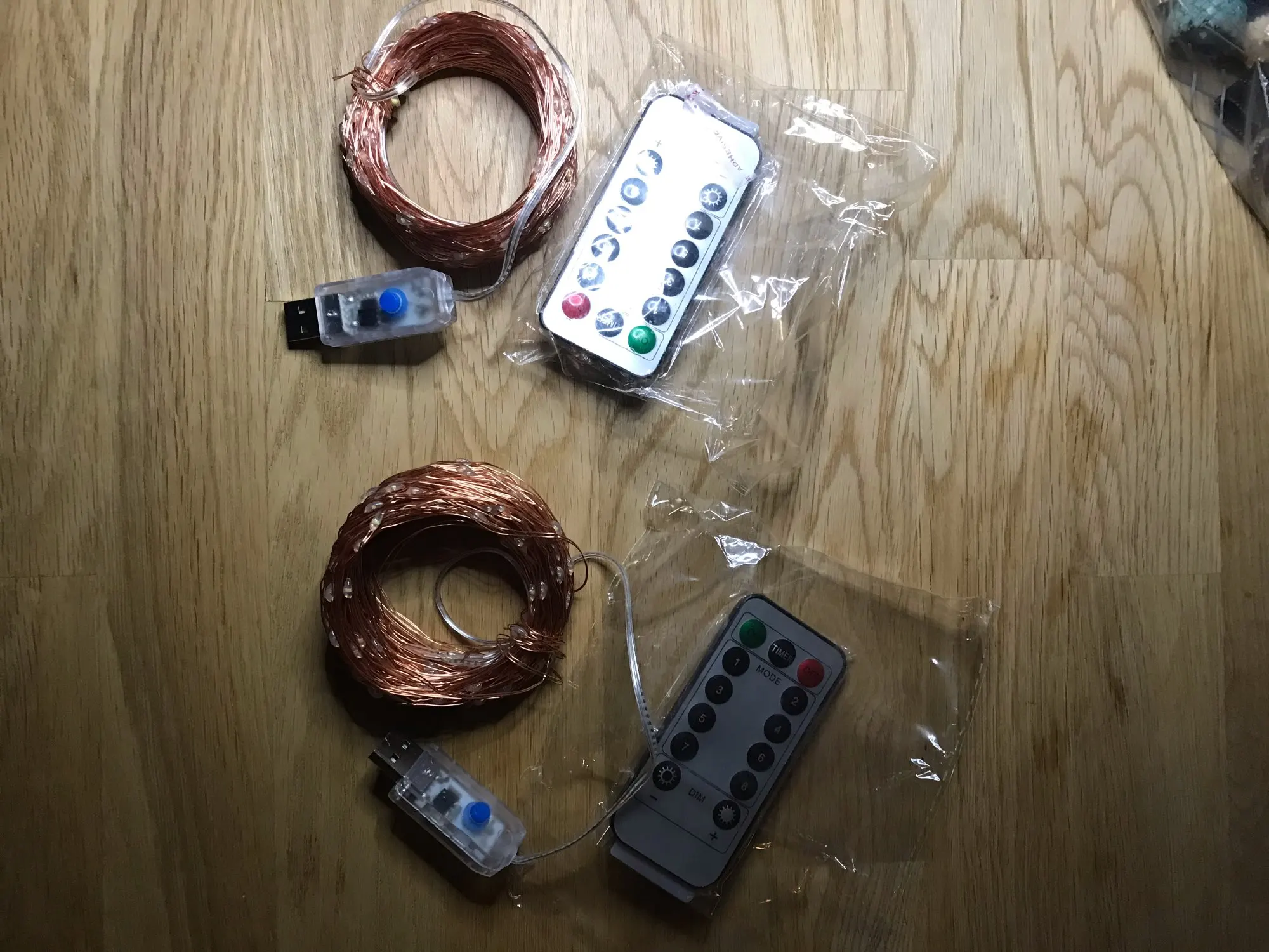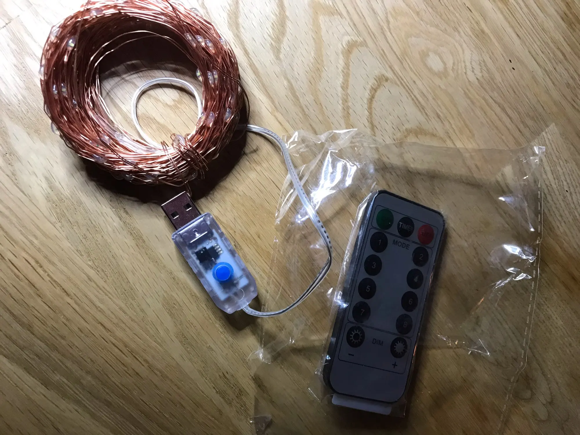 Яркие миниатюрные бескорпусные светодиоды на паре тонких жёстких эмалированных проводов. На ёлку ещё не укладывал - рано, - но работу проверил. Выглядит симпатично и более надёжно, чем гирлянды на корпусных светодиодах, спаянных на провод с полупрозрачной изоляцией. Батарейка CR2032 тоже помещается в пульт.