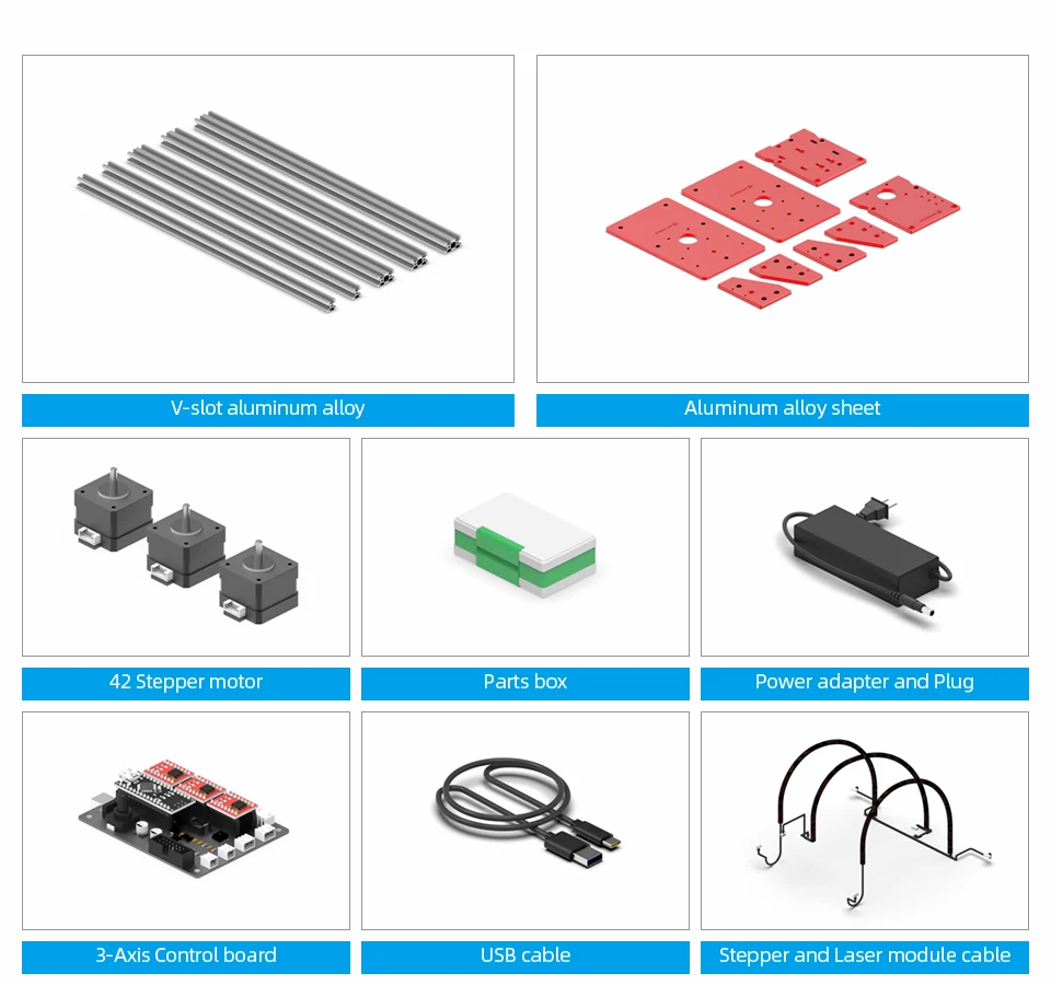1 x GKLaser гравер 4545 Pro (не собирается).(3 шт.) V-slot алюминиевый сплав 2040*600 мм(2 шт.) V-slot алюминиевый сплав 2020*600 мм(1 комплект) лист из алюминиевого сплава(1 комплект) кабель шагового двигателя(1 шт.) USB кабель(1 шт.) защитные очки(1 шт.) коробка деталей(1 шт.) адаптер питания(3 шт.) 42 шаговый двигатель(1 шт) 3-осевой Управление доска(1 шт.) карта (доступ к GKTOOLS®Веб-сайт и wiki)(1 комплект) крепление лазерного модуля (по вашему выбору)(1 комплект) крепление лазерного модуля и модуль малой мощности (по вашему выбору)(1 комплект) кабель адаптера лазерного модуля и модуль высокой мощности (по вашему выбору)