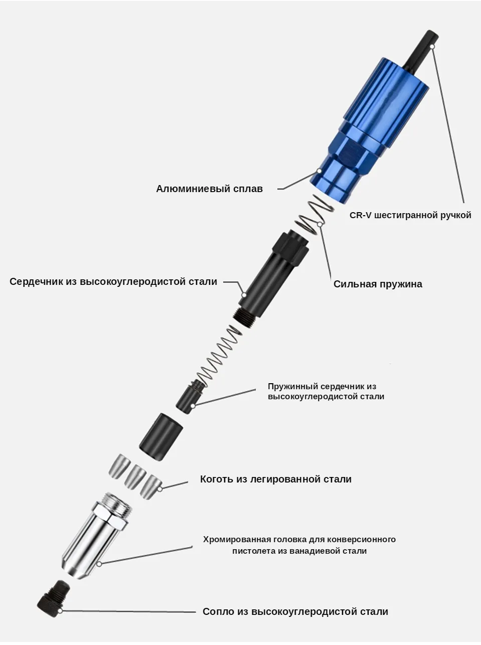 синий корпус похоже что из алюминия, лёгкий и не магнитися, все остальное сделано из стали. с заклёпкой 3.2 мм справляется хорошо, хвост выплёвывает сам. есть запасные губки. товаром доволен. посмотрим насколько хватит