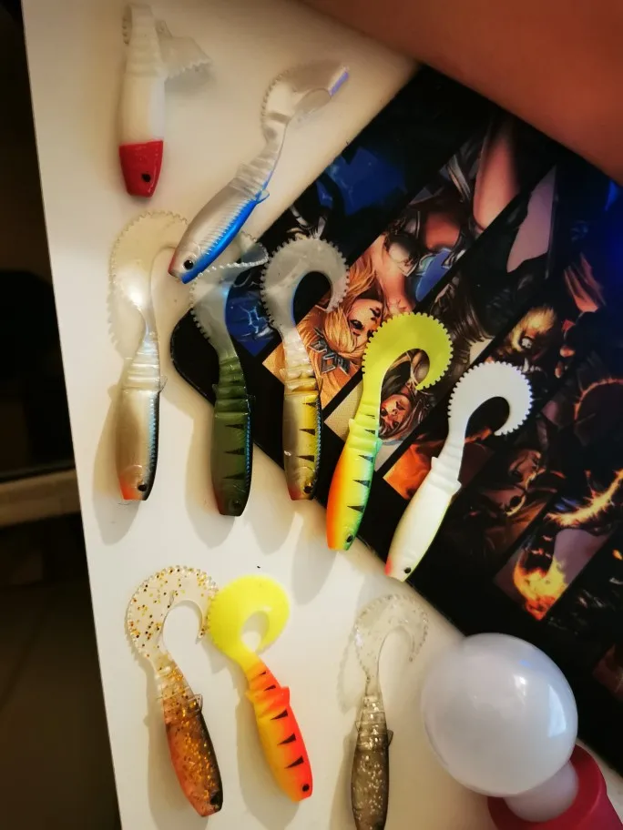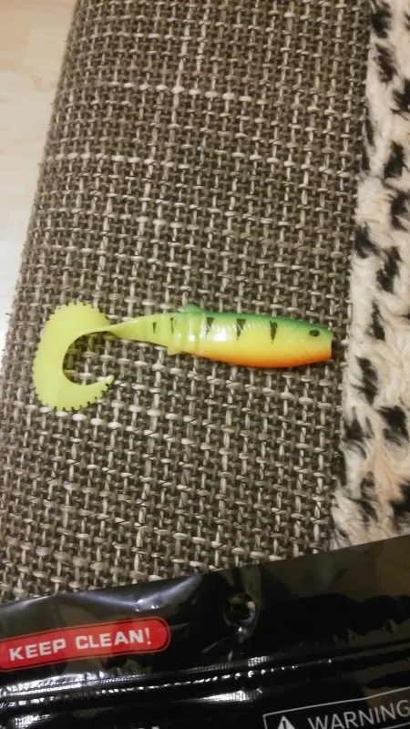Необычного типа твистеры. Провëл офсет до ребристого хвоста, скорее всего это максимальное для него расстояние. На подобные ловить не пробовал, но выглядит он, конечно, шикарно. Очень порадовала упаковка, внутри пакета с застëжкой есть пластиковая "тарелочка", которая не даëт хвосту деформироваться.