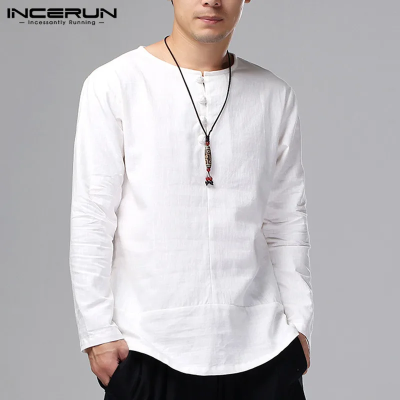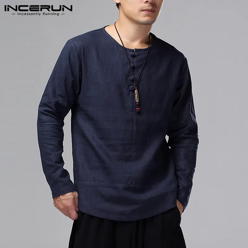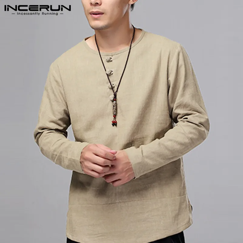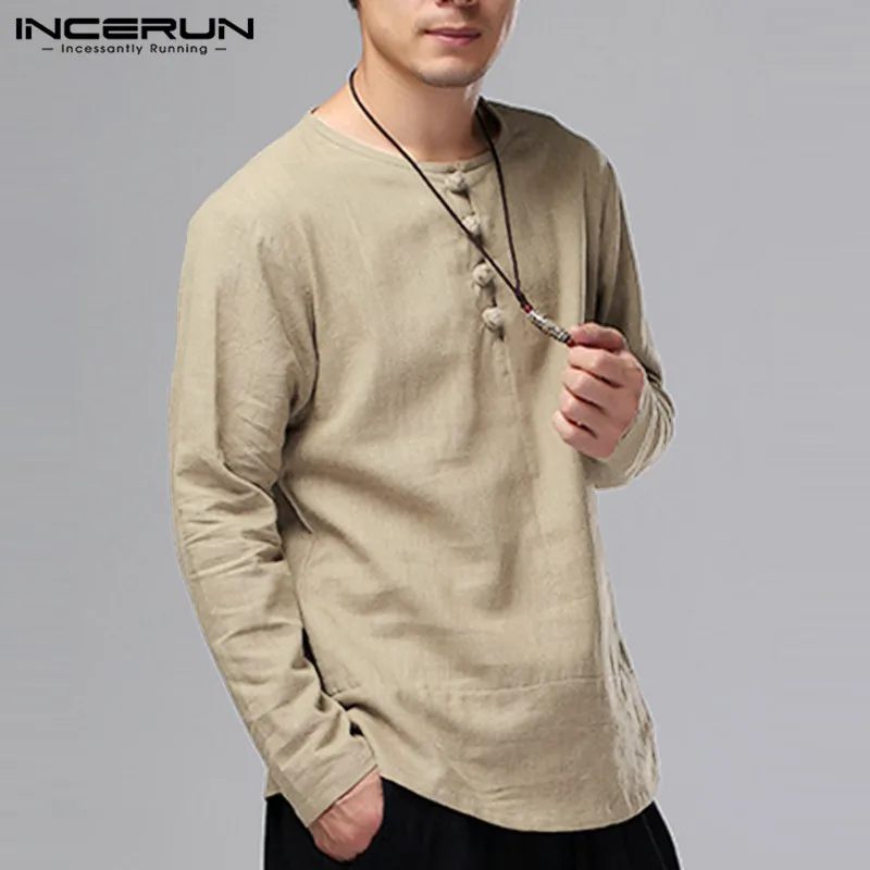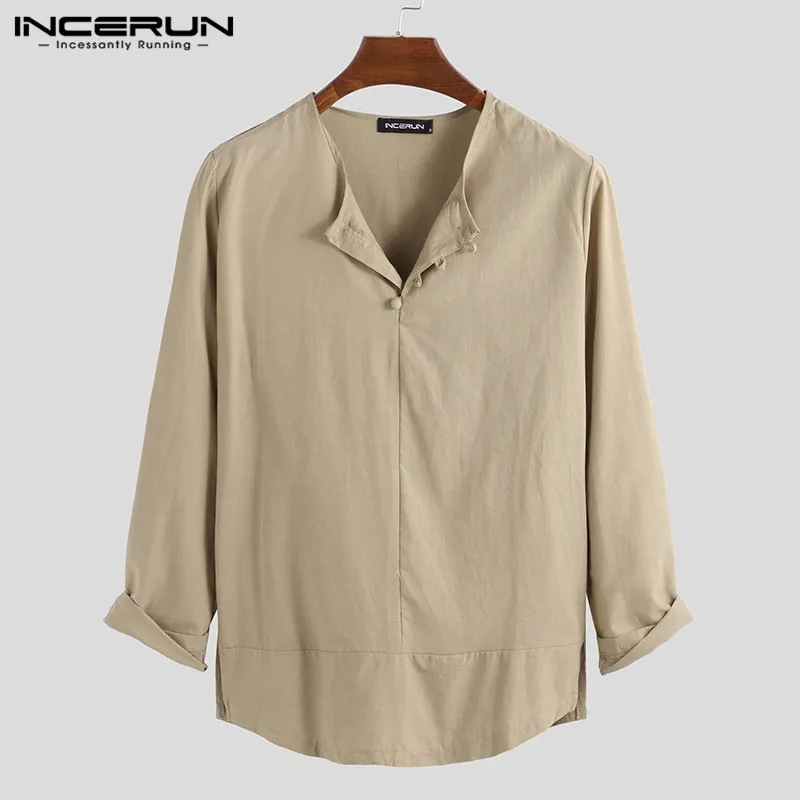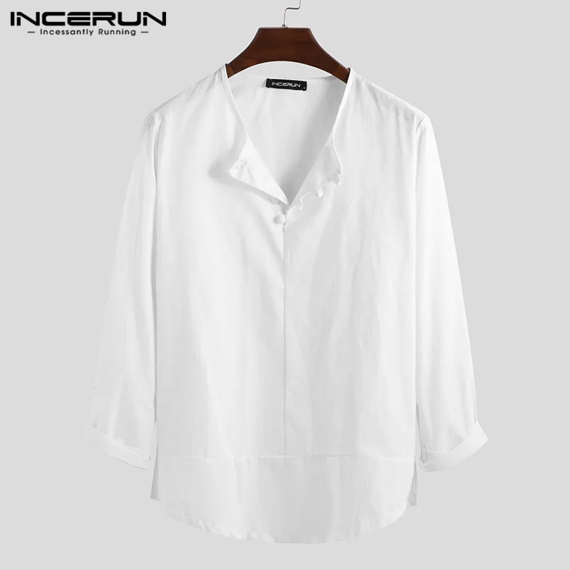 INCERUN винтажная Мужская рубашка с длинным рукавом из хлопка уличная пуговица кунг-фу Однотонная рубашка в китайском стиле Camisa мужская Повседневная рубашка 2020