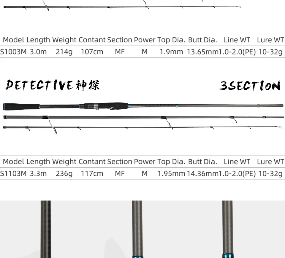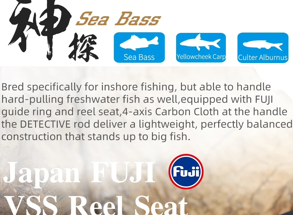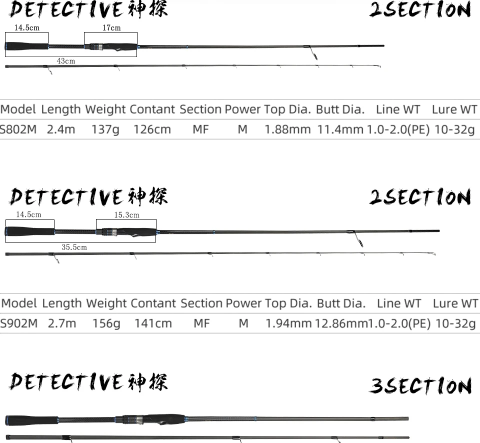 Особенности продукта:1. FUJI анти-обмотки K кронштейн и FUJI кольцо принимаются. Кольцо FUJI A имеет лучшую износостойкость, теплоотдачу и легкий вес.2. Установите Сиденье Катушки FUJl, чтобы вы чувствовали себя комфортно, увеличивая точность и стабильность литья.3. Расширенная ручка EVA, точное длинное литье, выведено специально для подводной рыбалки4. Используйте секционную Пробковую ручку, удерживайте ощущение комфорта и освещения, эффективно уменьшая усталость.5.DETECTIVE использует Toray 30T углеродную тканьИнформация о продукте:1. Тип: спиннинговая удочка2. Длина расширение: 2,4 м/2,7 м3. Контактная длина: 126 см/141 см4. Вес: 137 г/156 г5. Секции: 2/26. Мощность: М7. Действие: MF8. S802M (вес приманки): 10-32 гS902M (вес приманки): 10-32 г9. Ручка: Расширенная ручка EVA10. Материал: углеродное волокно Toray 30T11. Направляющее кольцо: направляющее кольцо серии FUJI K12. Сиденье Катушки: Сиденье Катушки FUJIПосылка:1 х Удочка для приманки1 х сумка для удочек