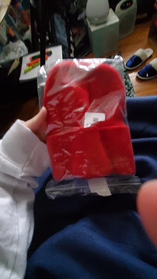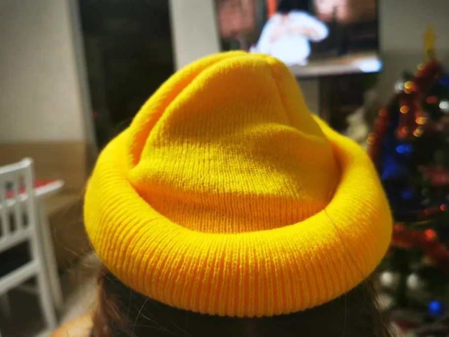 Красная шапочка смотрится по другому, если ее подвернуть, как на фото, то не остаётся места на макушке и она обтягивает голову полностью. Синтетика. Но если не подворачивать, то верхушка на макушке торчит как надо. Все остальное как заявлено в описании