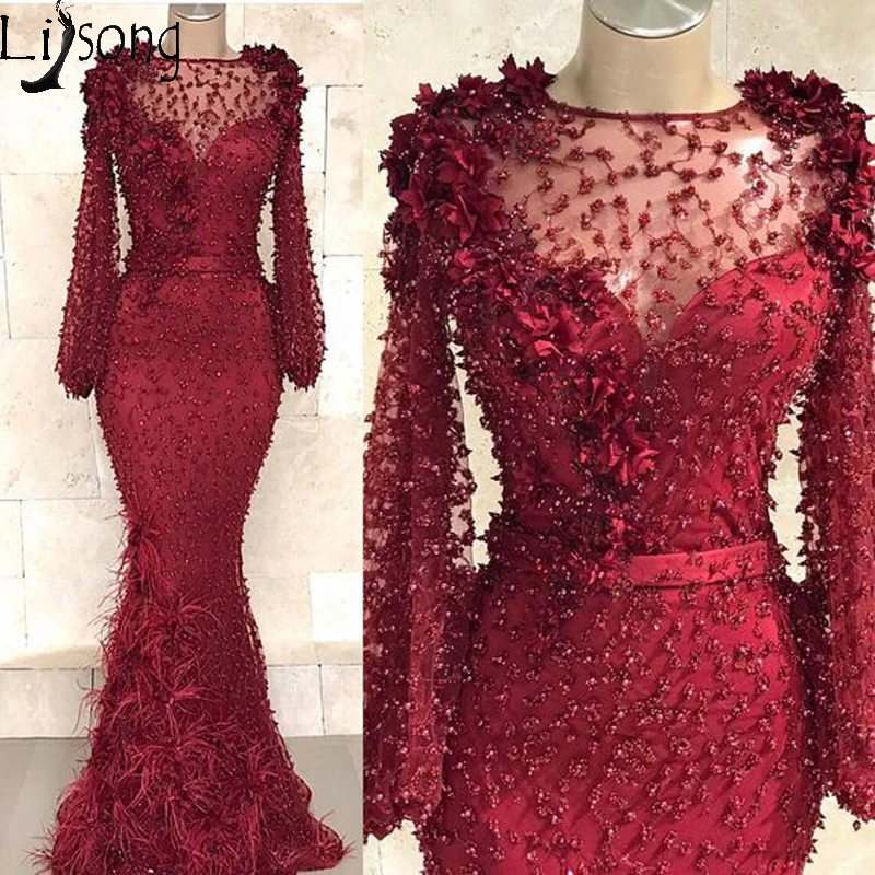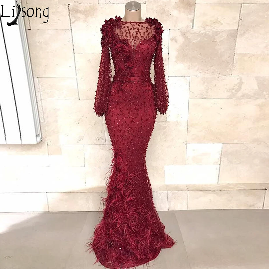 Модное Вечернее платье Abendkleider, Бордовое платье русалки с длинным рукавом и перьевой аппликацией, вечернее платье
